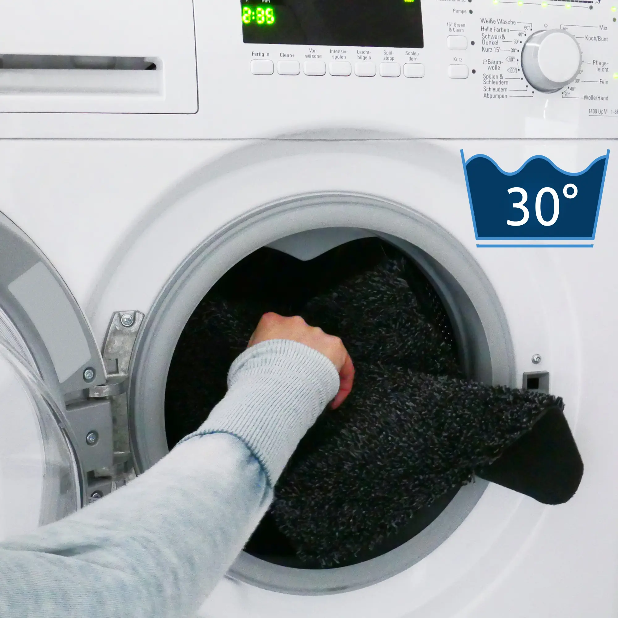 Bei starker Verschmutzung wird der Stufen-Teppich einfach in der Waschmaschine bei 30°C gewaschen.