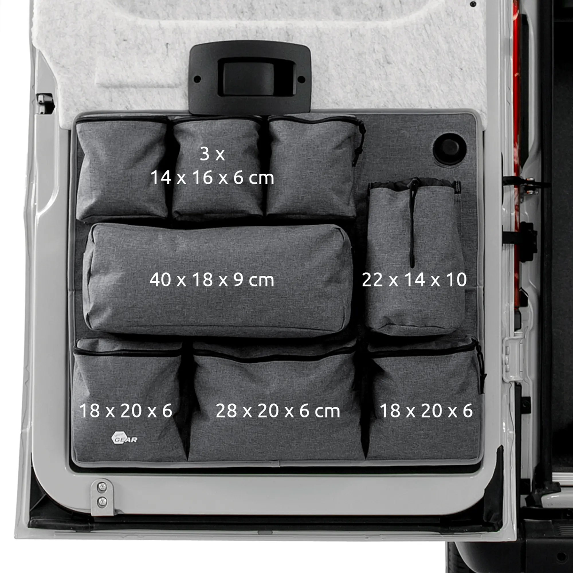 Jeder Organizer verfügt über 8 robuste Taschen in unterschiedlichen Größen. Sie bieten im Transporter ausreichend Platz für Werkzeug, Campingzubehör, Reiseutensilien und Alltagsgegenstände. Durch die intelligente Aufteilung ist alles schnell griffbereit.