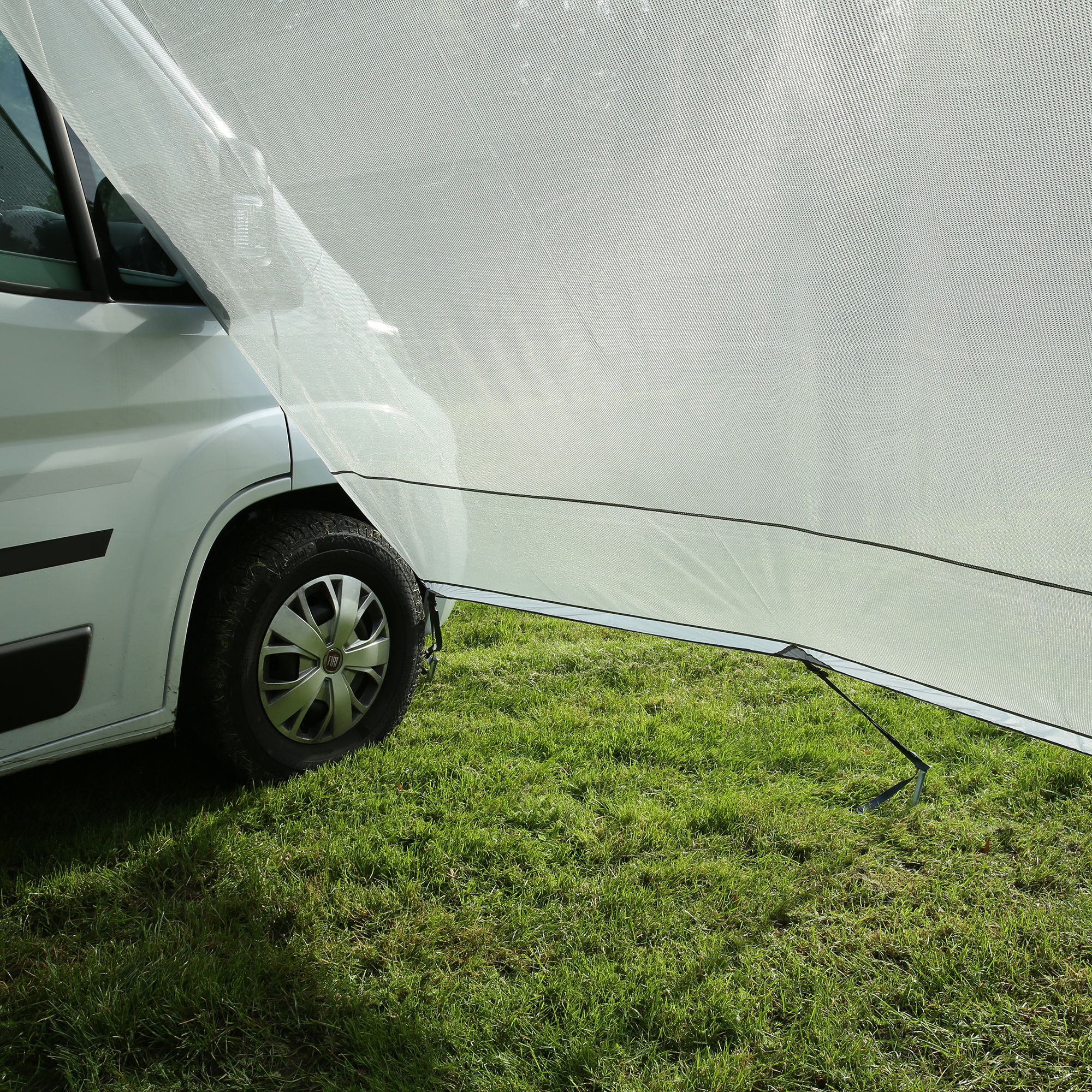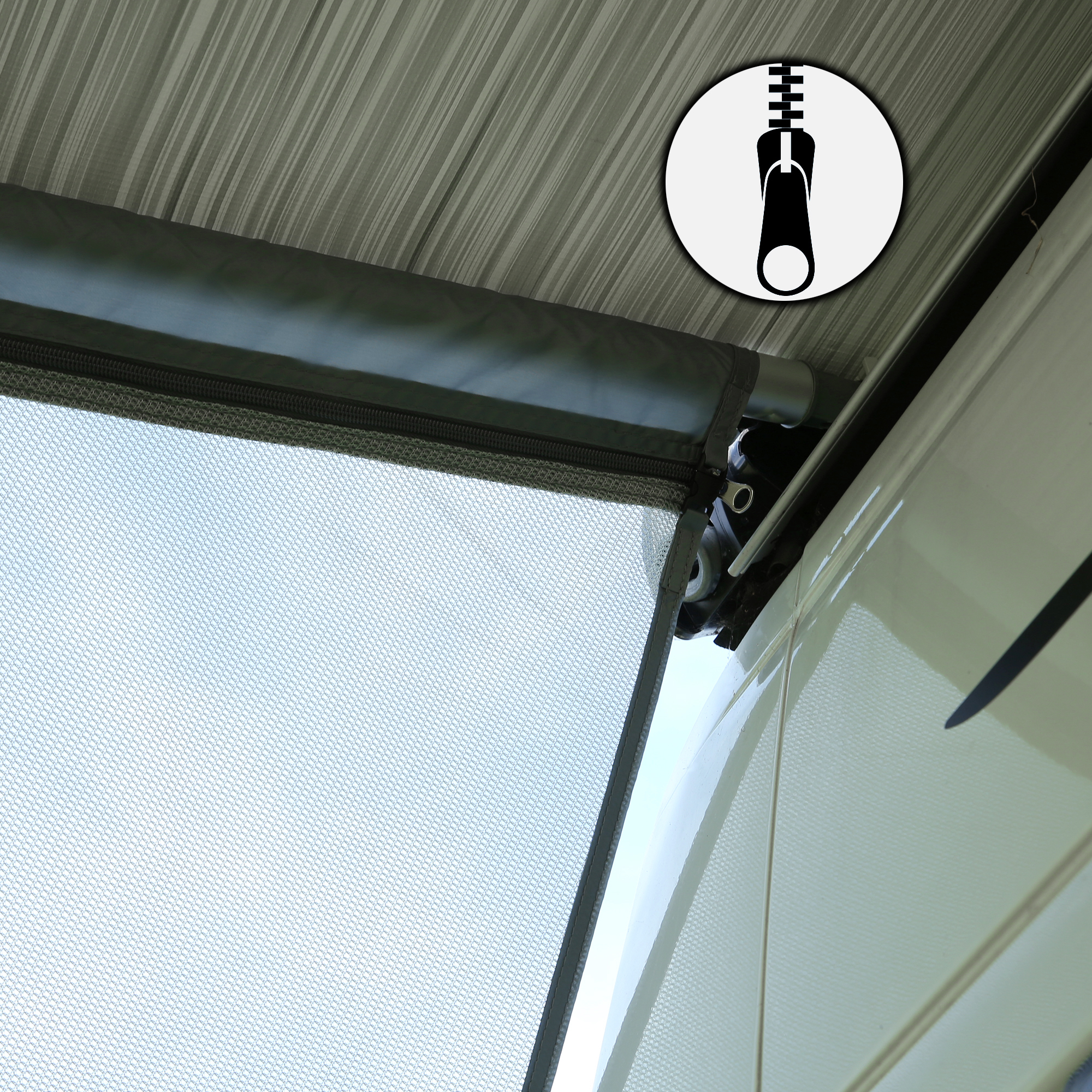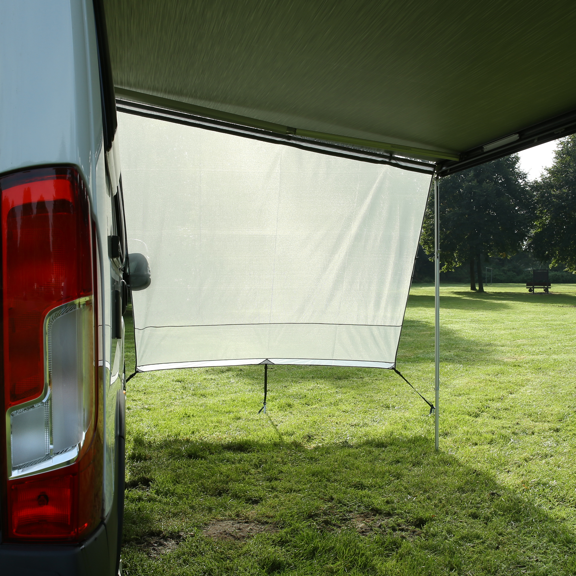 Estas paredes laterales han sido especialmente desarrolladas para autocaravanas, caravanas y remolques y son perfectas para toldos de los fabricantes Thule, Fiamma o Dometic. Se montan fácilmente en el toldo utilizando varillas de tensión. La tela especial permeable al viento no solo proporciona una protección óptima contra el sol y la privacidad, sino también una ventilación agradable. De esta manera, puede disfrutar de horas cómodas al aire libre incluso en días calurosos.