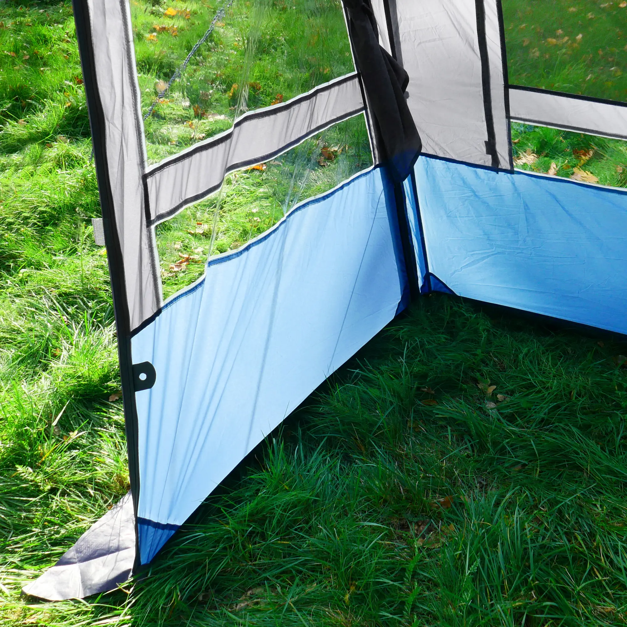 - Toldo de viaje con 250 cm de profundidad y pared frontal desmontable. La pared frontal se fija al toldo con una cremallera. Sin la pared frontal, la tienda se puede utilizar como un gran toldo