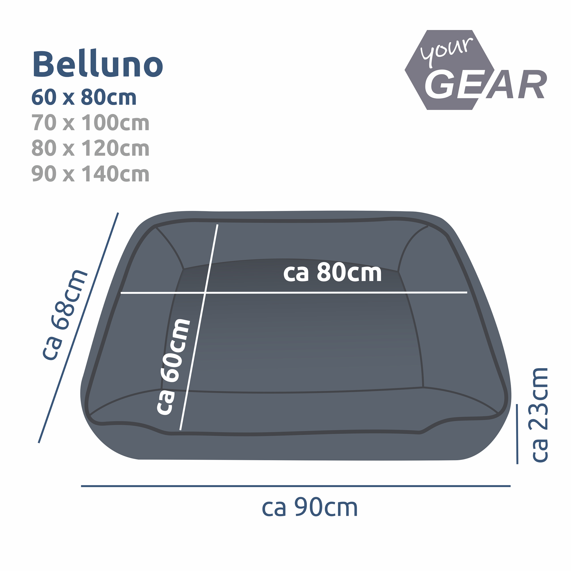 - ¿Qué tamaño? Longitud del perro (de la nariz a la cola) + margen de longitud (mín. 20 a 30 cm) = longitud de cama recomendada. El Belluno está disponible en 4 tamaños: 60 x 80 cm (3,7 kg), 70 x 100 cm (4,9 kg), 80 x 120 cm (6,2 kg) y 90 x 140 cm (7,6 kg) - altura del borde: 20 cm