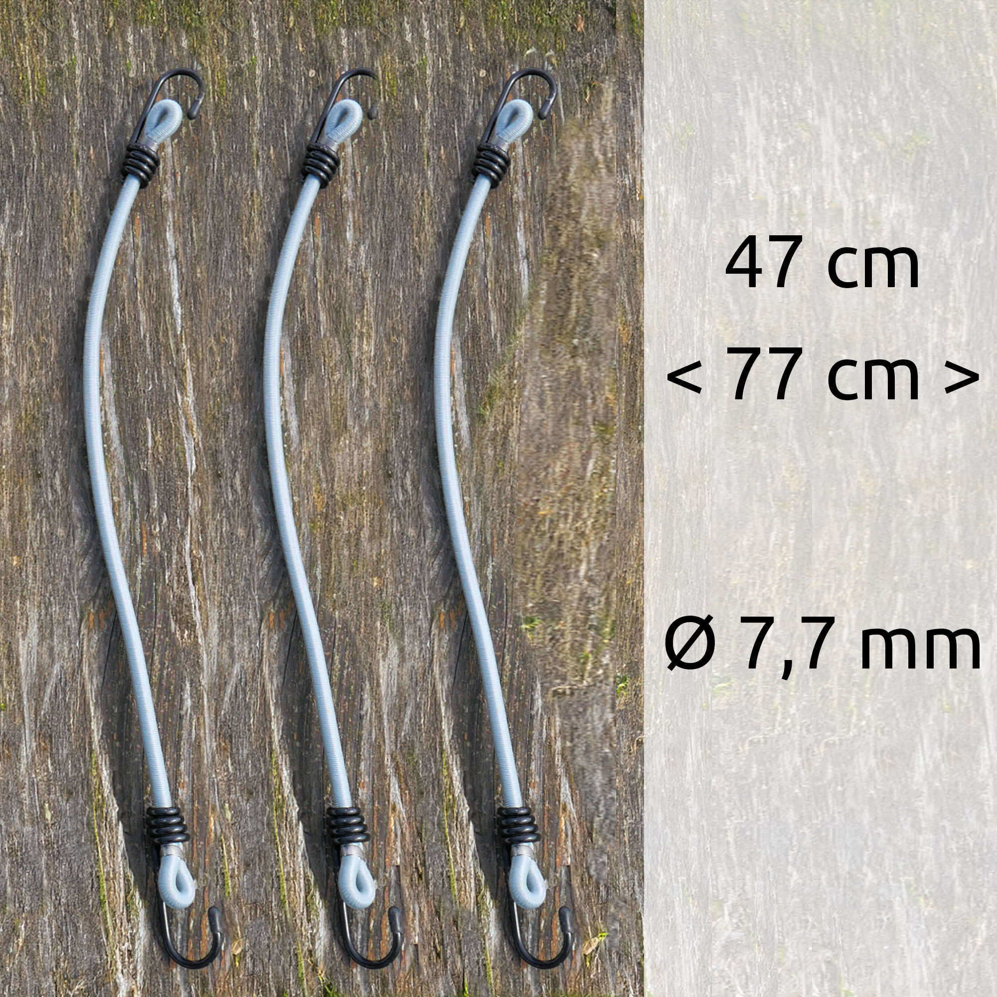 La livraison comprend 3 cordes de haubanage d´une longueur de 47 cm, qui peuvent être rallongées jusqu´à 77 cm. Les boucles de tension robustes sont cousues sur la bâche en position décalée afin que les crochets métalliques des extenseurs ne puissent pas endommager votre véhicule. Nous fournissons également un sac de transport hydrofuge pour faciliter le rangement de la bâche et des caoutchoucs.