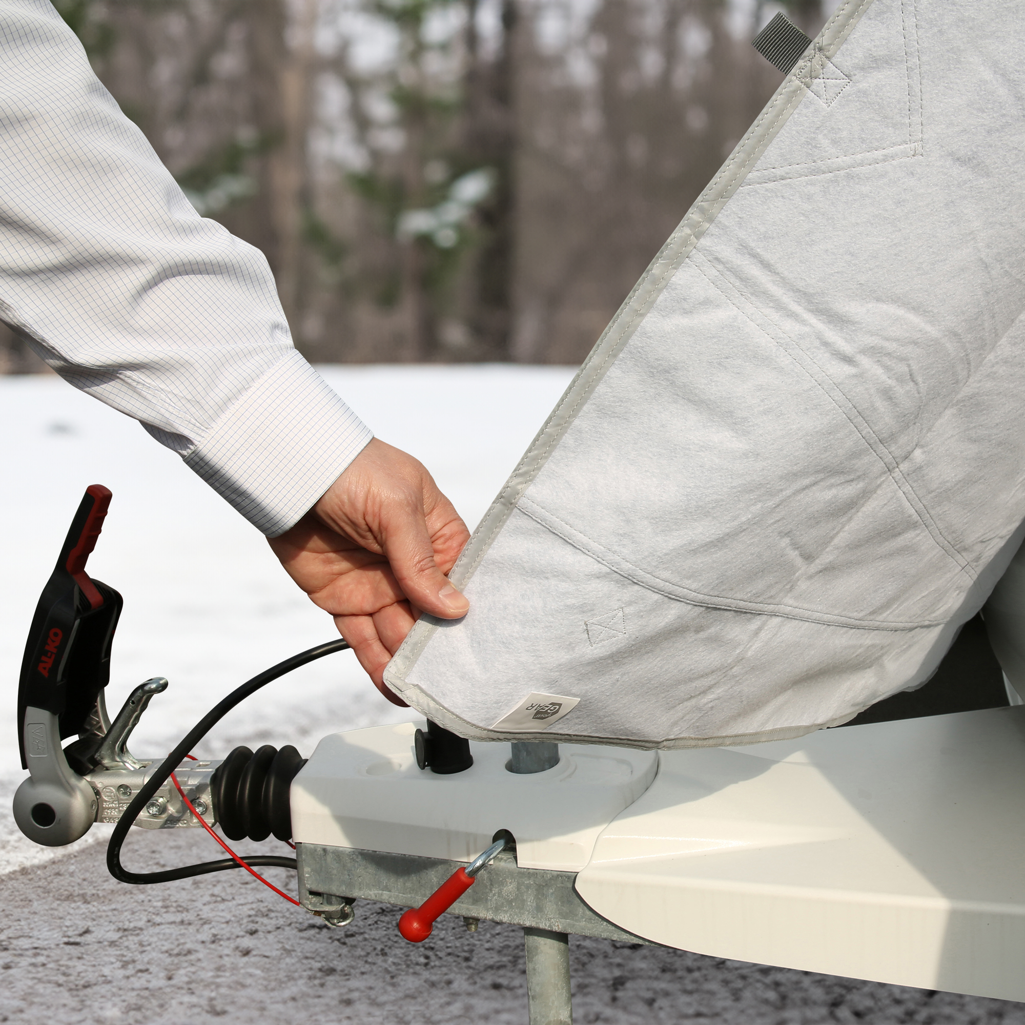 - Uso en invierno: la lona se utiliza como lona frontal en la estación fría. Cubre la ventana delantera y la caja de la lanza equipada con bombonas de gas. Evita que la solapa de la caja de la bombona y la ventana se hielen y se congelen y también protege contra las corrientes de aire