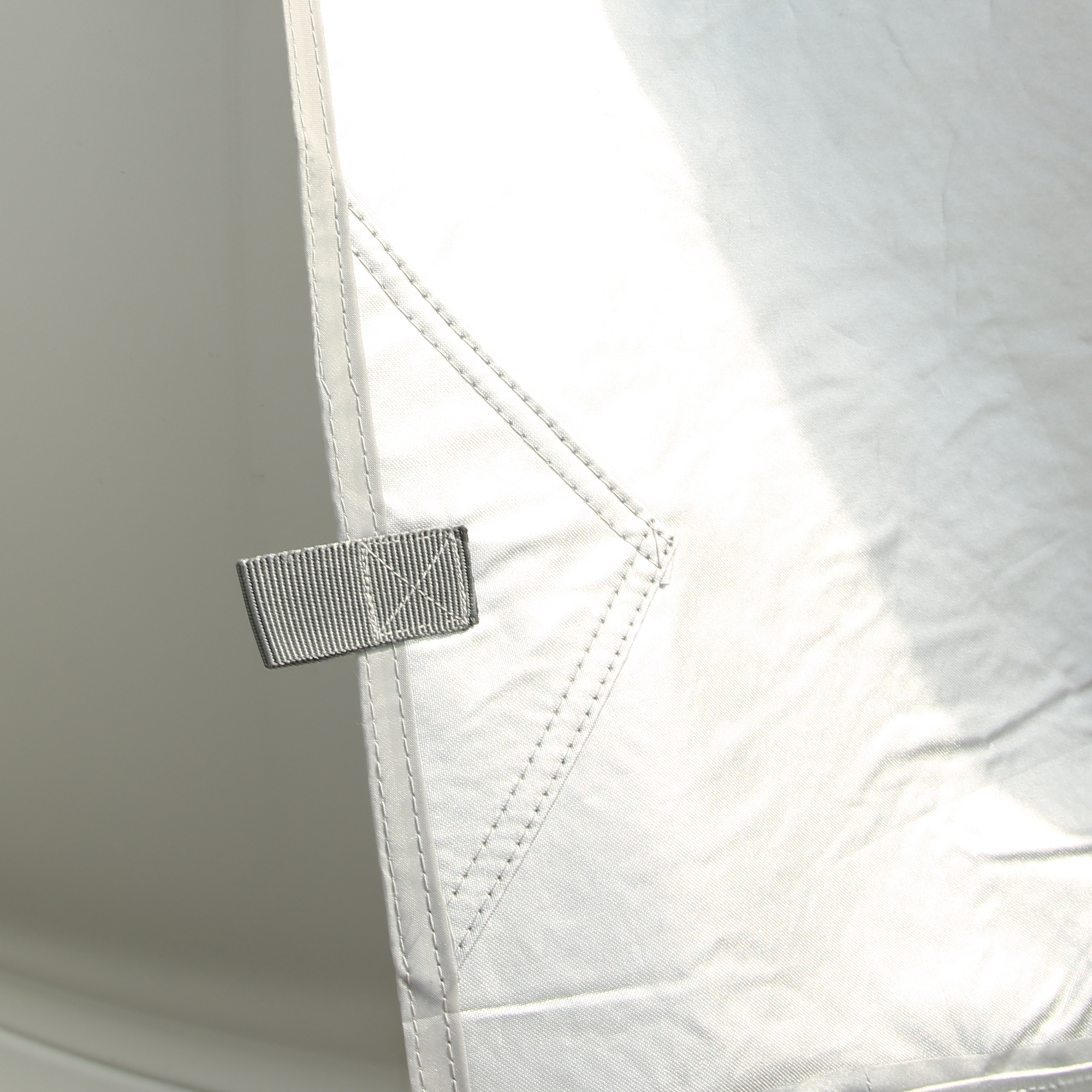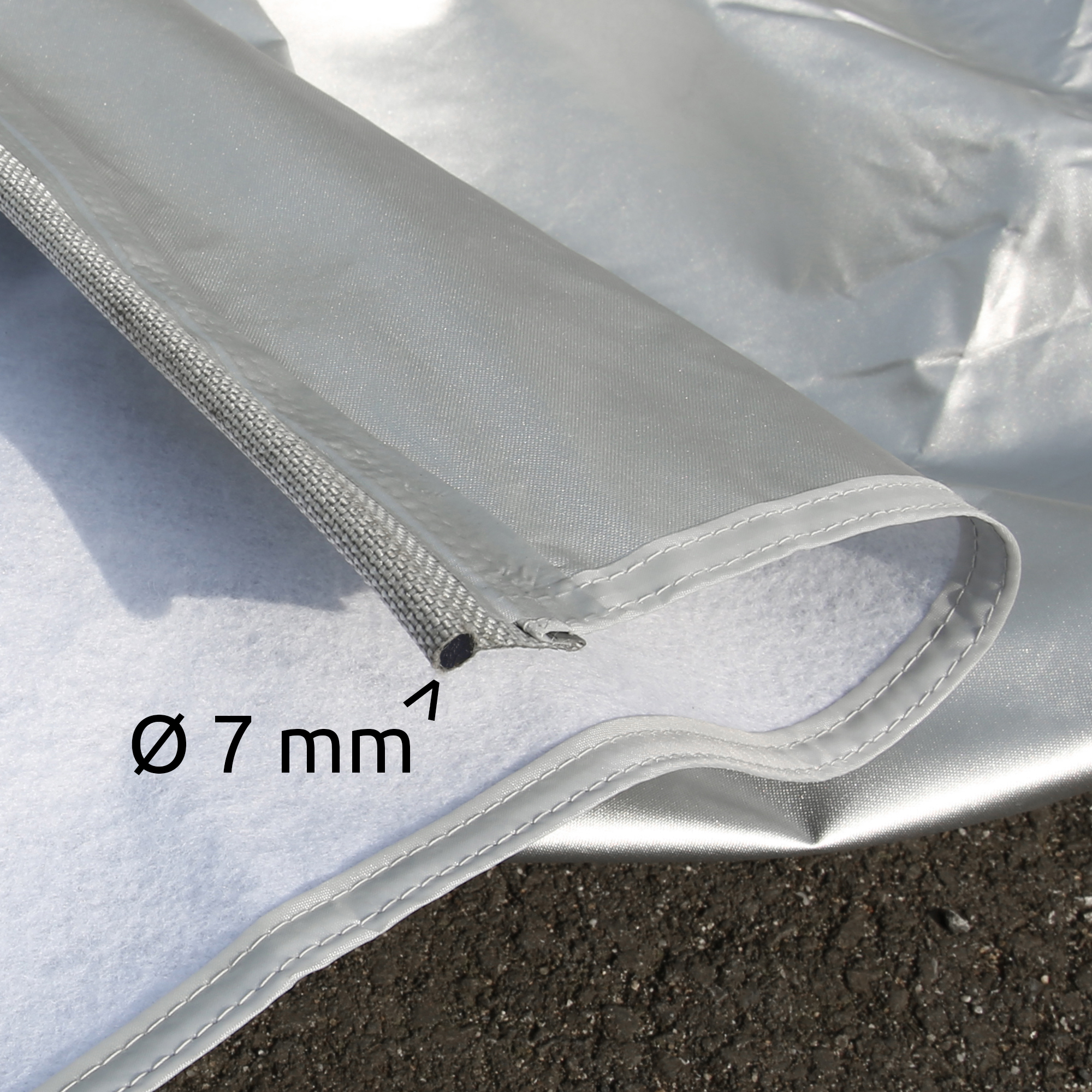 - Material - la lona protectora está compuesta por un material portante de poliéster Oxford con una columna de agua de 5000 mm y protección UV 80+, que está laminado en el exterior con una capa de aluminio y en el interior con una suave capa de vellón térmico. Se fija mediante un ribete estándar de 7 mm, que se introduce en la tira de ribete de la caravana