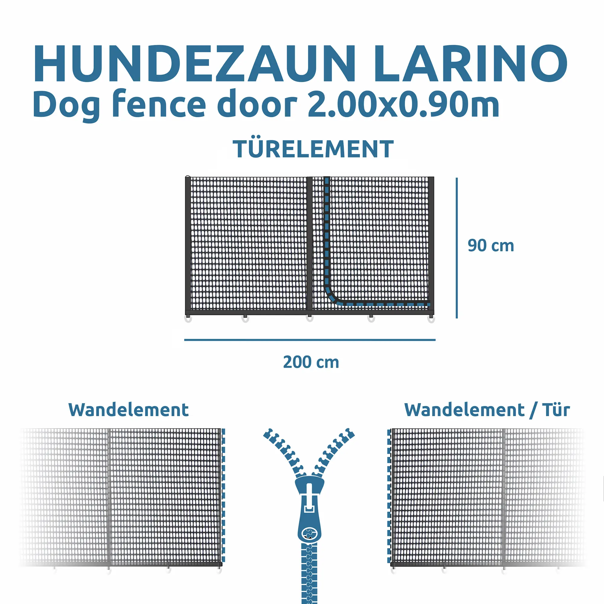 - Larino - valla móvil para perros para el camping o el jardín. El recinto robusto y estable es adecuado para todos los amigos de cuatro patas, se puede montar rápidamente y se puede ampliar según sea necesario con elementos de 4 metros (Larino 400) o elementos de puerta de 2 metros (Larino Door)