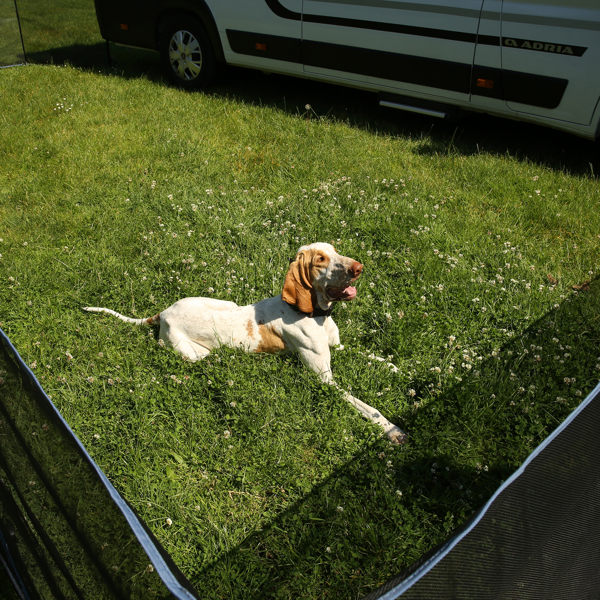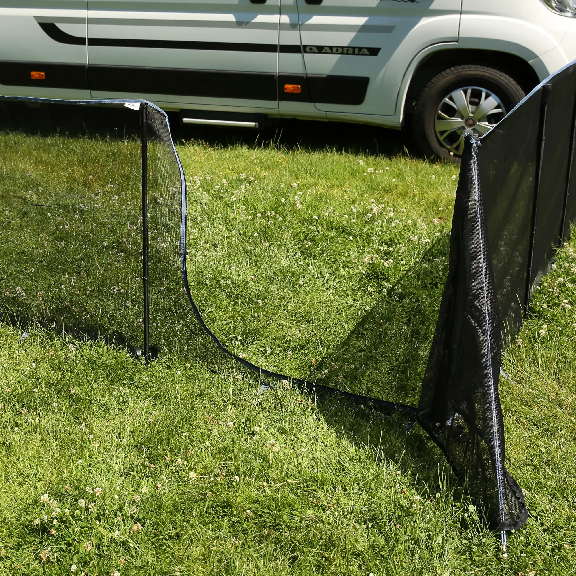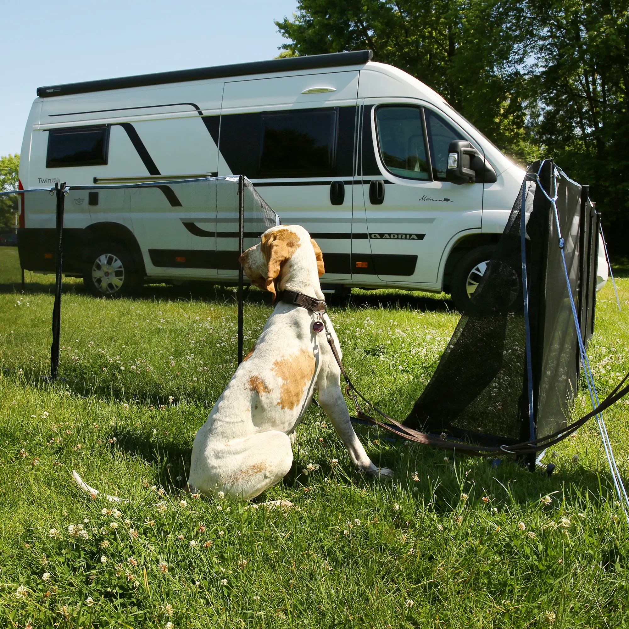 L’installation est entièrement personnalisable – que ce soit sous forme de rectangle fermé, en clôture en U devant votre caravane ou camping-car… les possibilités sont infinies. Les poteaux métalliques thermolaqués et les piquets de sol robustes assurent une grande stabilité et un maintien fiable sur toute pelouse.