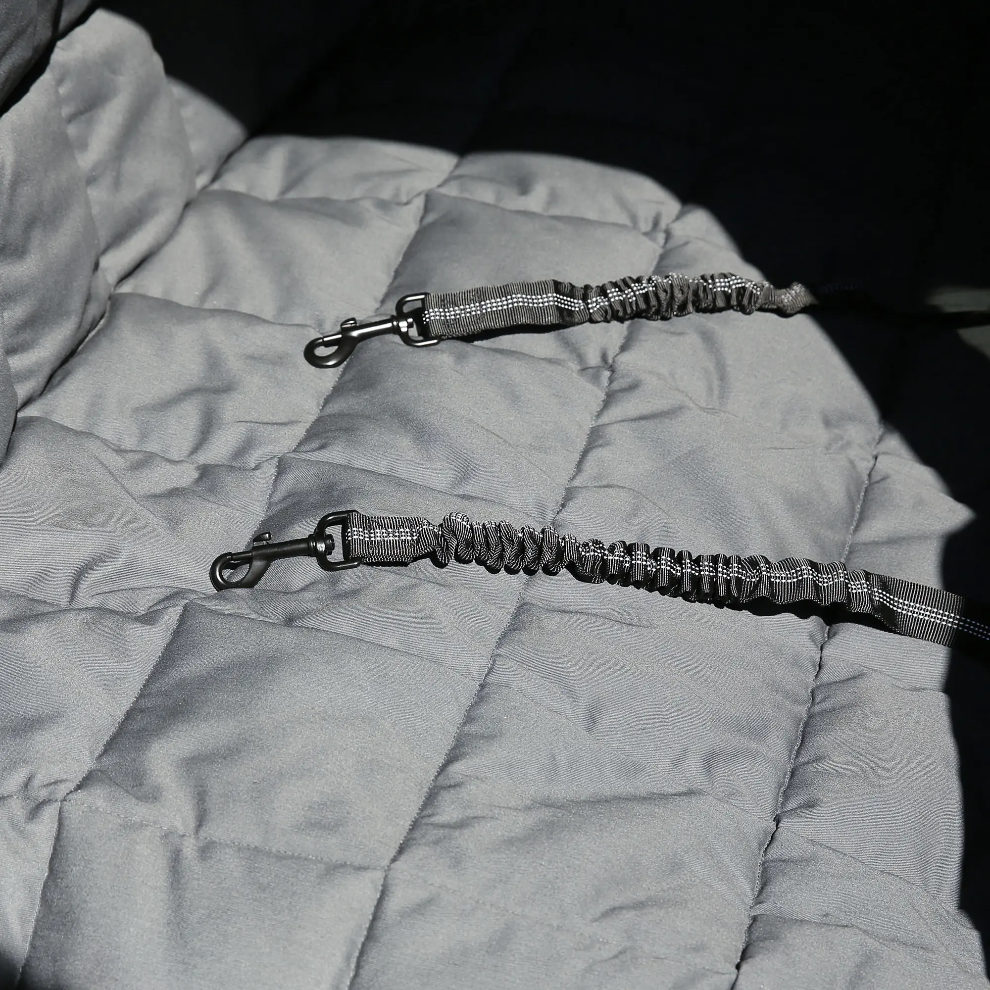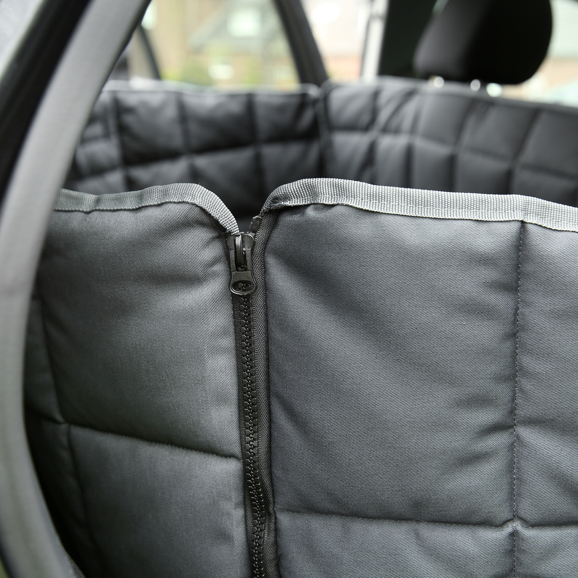 Lors du transport de votre chien en voiture, celui-ci doit être correctement sécurisé. Nous fournissons deux laisses réglables pour chien qui sont sécurisées via les connecteurs de ceinture de sécurité. Des fermetures éclair multifonctions sont placées aux points nécessaires pour accéder à ces points d´attache.