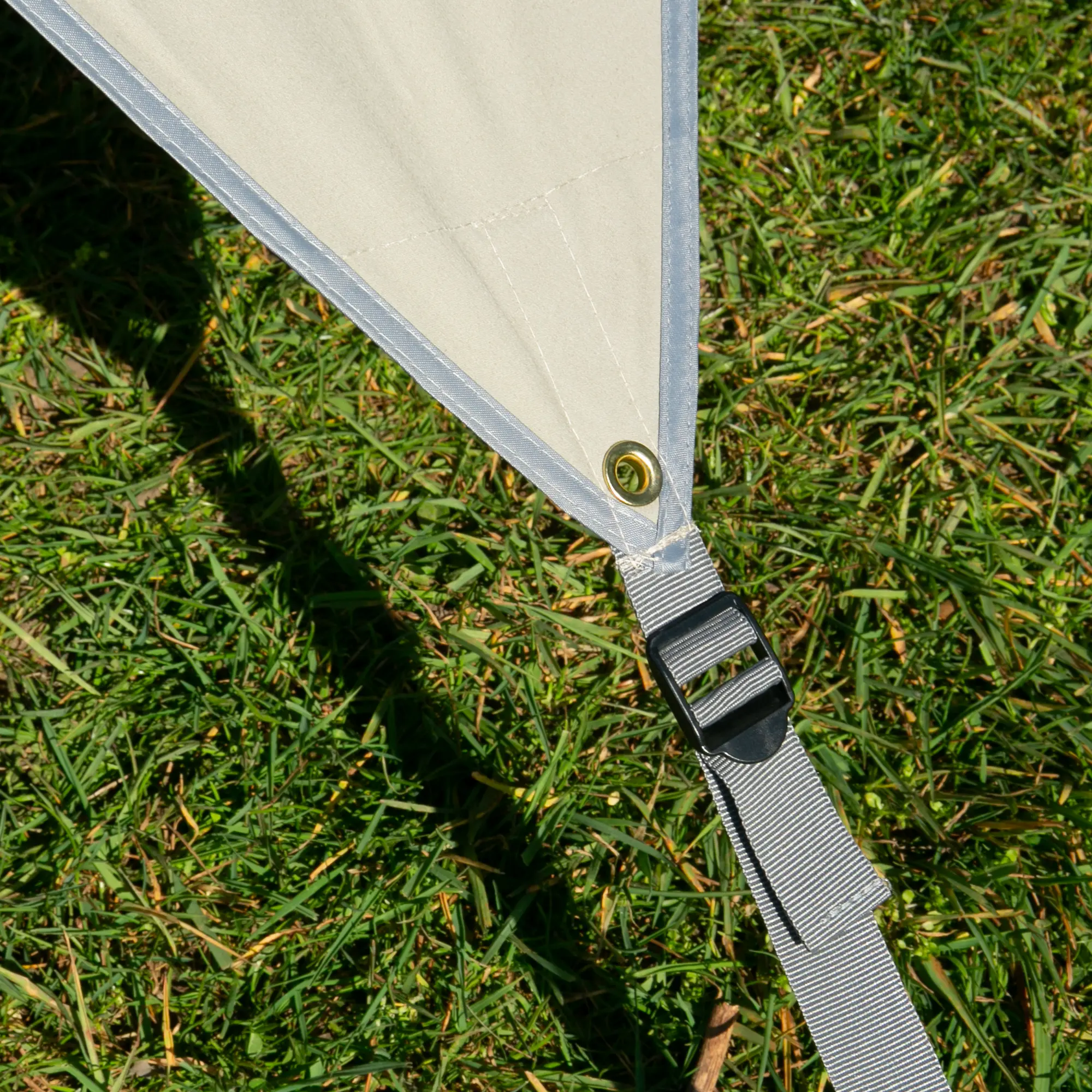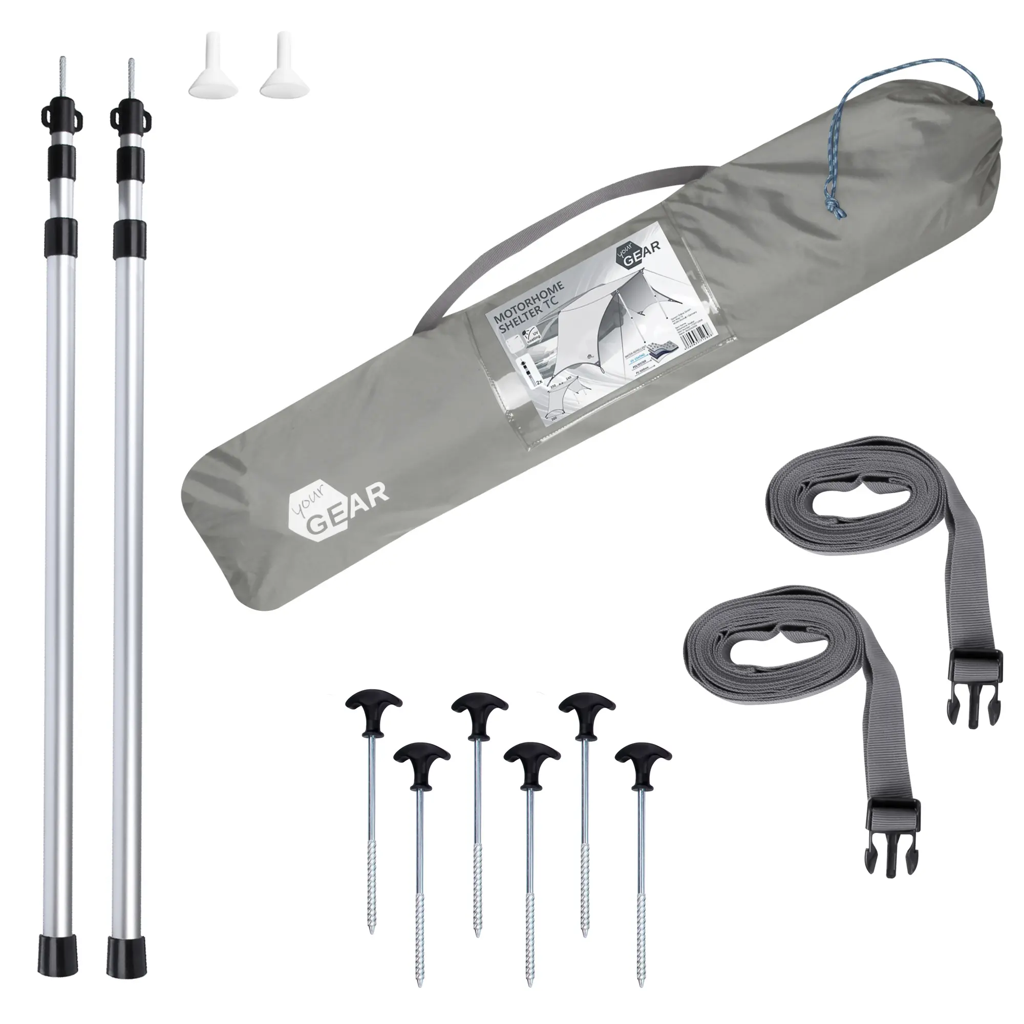 Inclus : 2 mâts télescopiques en aluminium pour la partie avant, 2 sangles de haubanage avec clip et des piquets. Les mâts sont réglables jusqu’à 235 cm. La toile comporte plusieurs œillets pour différentes options de montage. Tous les points de tension sont doublés et renforcés. Le tissu est facile à nettoyer et sèche rapidement.