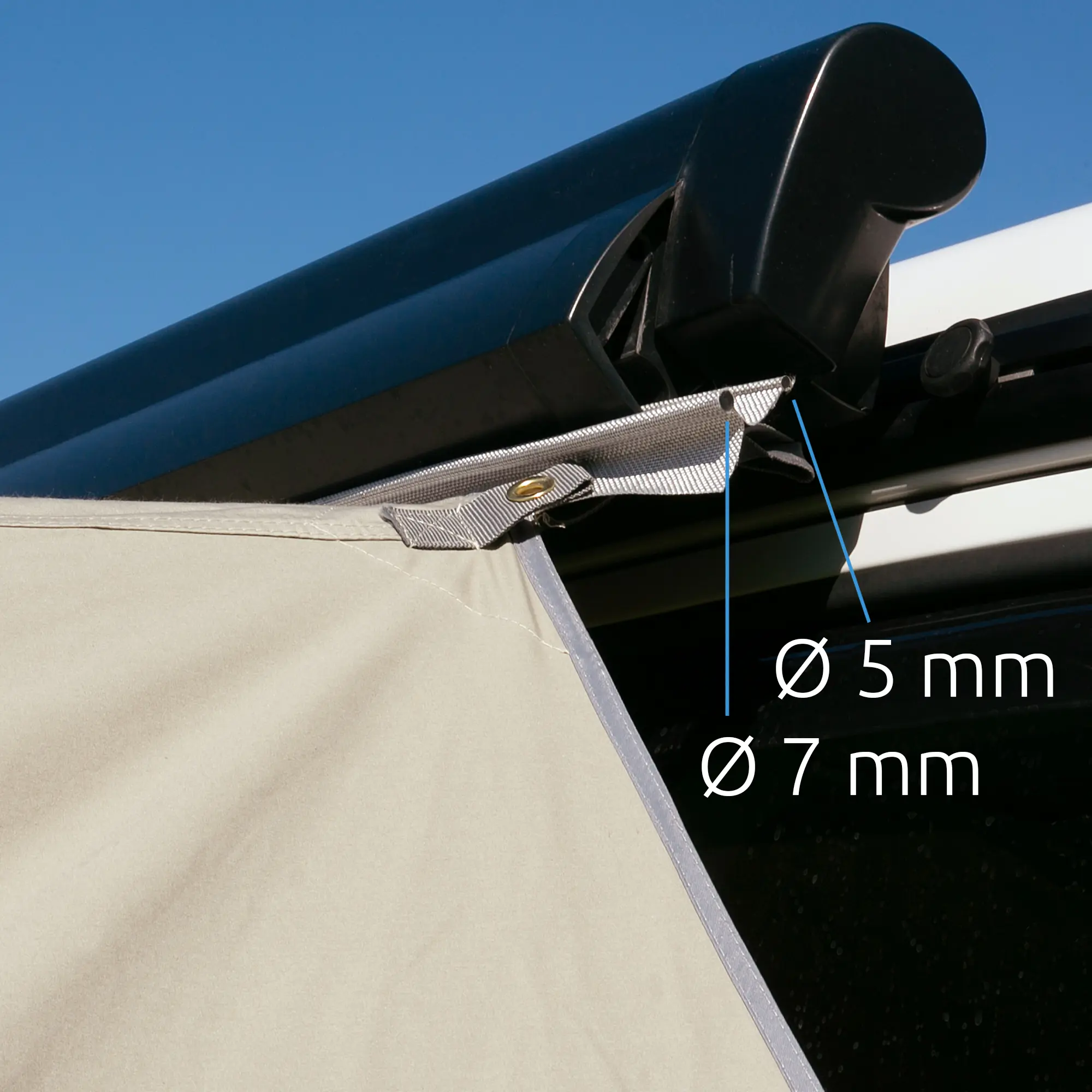 Si votre véhicule n’a pas de glissière, vous pouvez fixer la toile à la galerie de toit du van avec les 3 sangles réglables cousues.