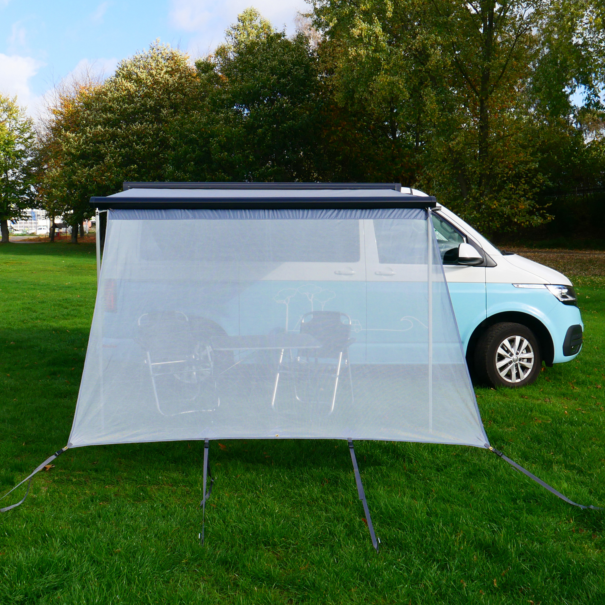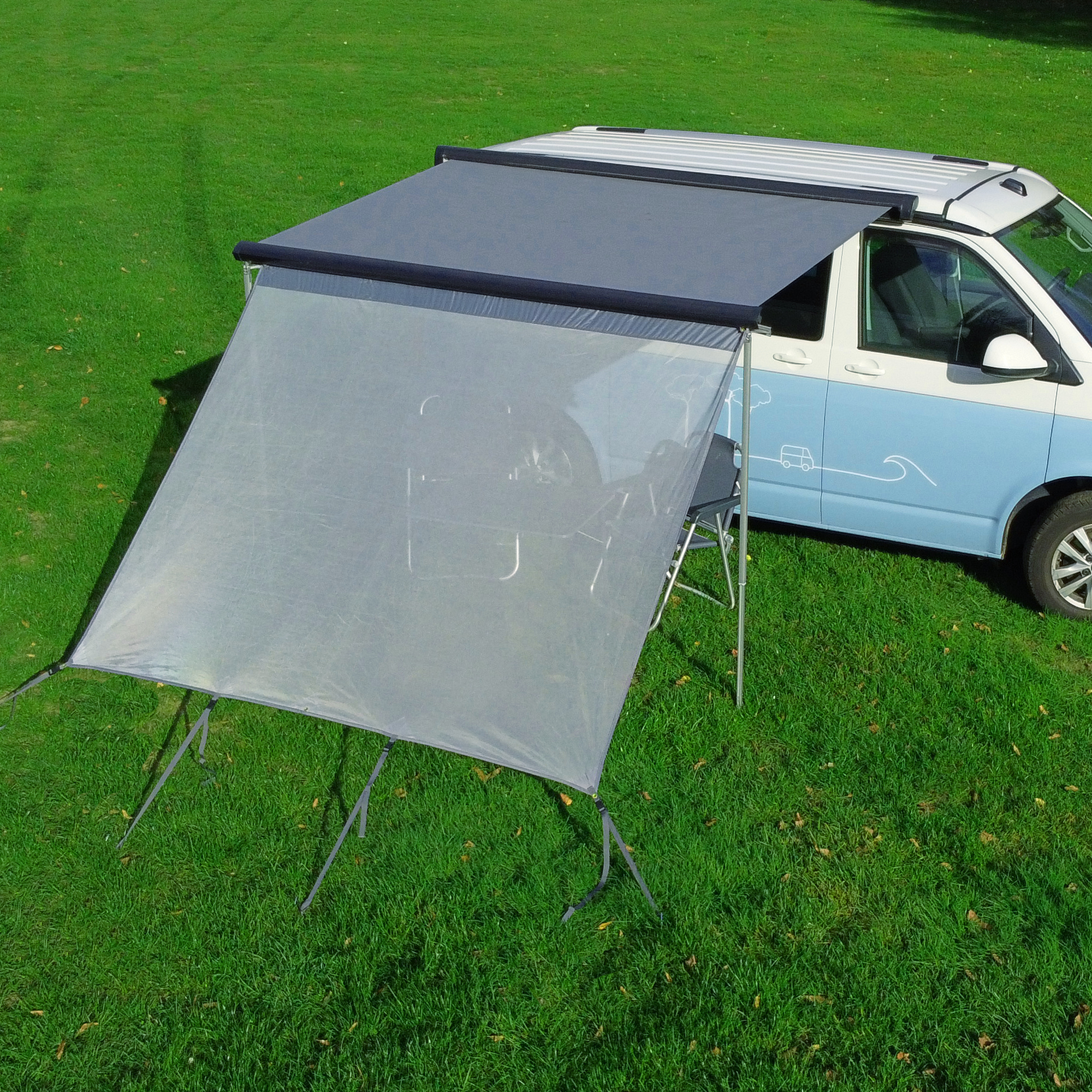 Il tessuto a rete attaccato fornisce ombra e offre anche una certa protezione contro il vento. Il tessuto fornisce circa il 60% di ombreggiatura. Il materiale è completamente permeabile all´aria e trasparente. Puoi vedere attraverso di esso e osservare cosa succede intorno a te. Inoltre, la parete aumenta la stabilità della tenda da sole in quanto agisce come un sistema di tensione, assicurando ulteriormente la tenda da sole del veicolo in caso di vento leggero.