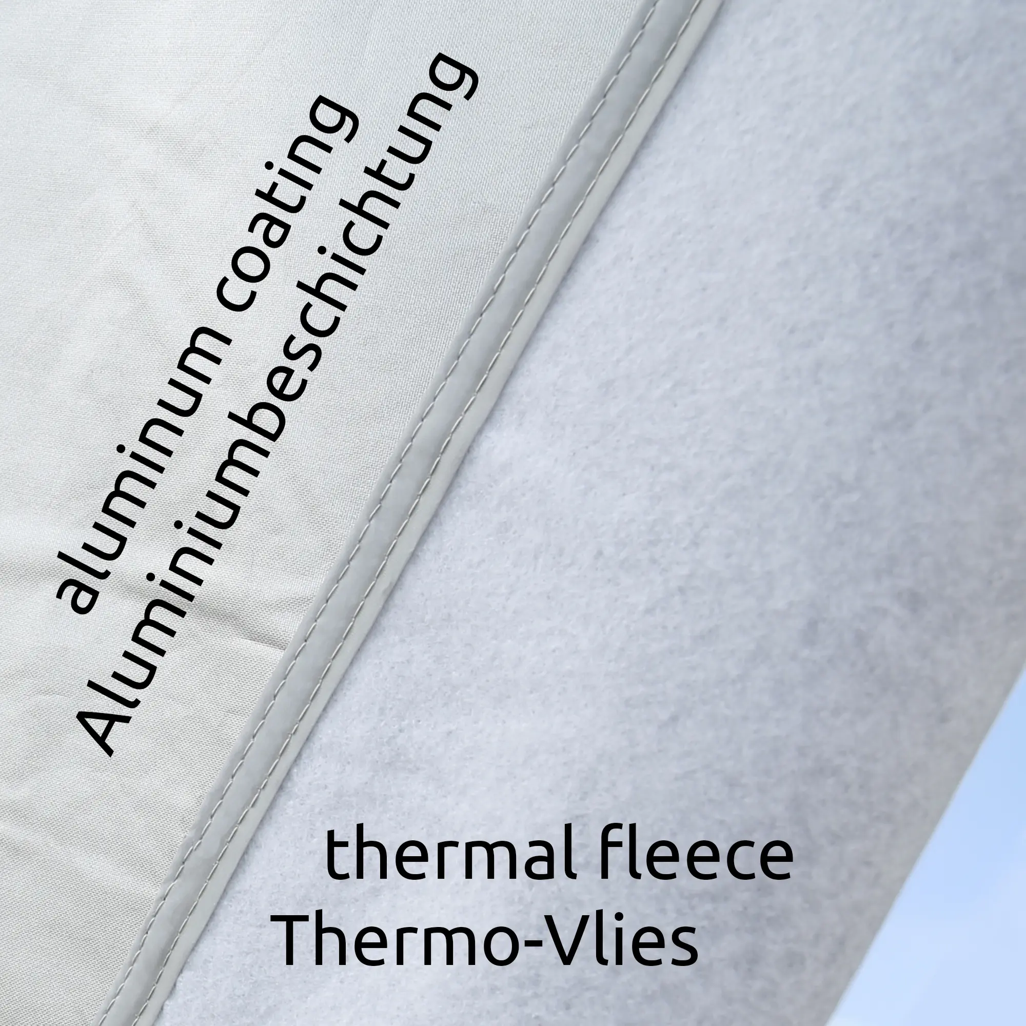 Il lato esterno rivestito in alluminio riflette i raggi UV e il calore intenso della luce solare. Il pile speciale interno agisce come isolante e previene un aumento della temperatura.