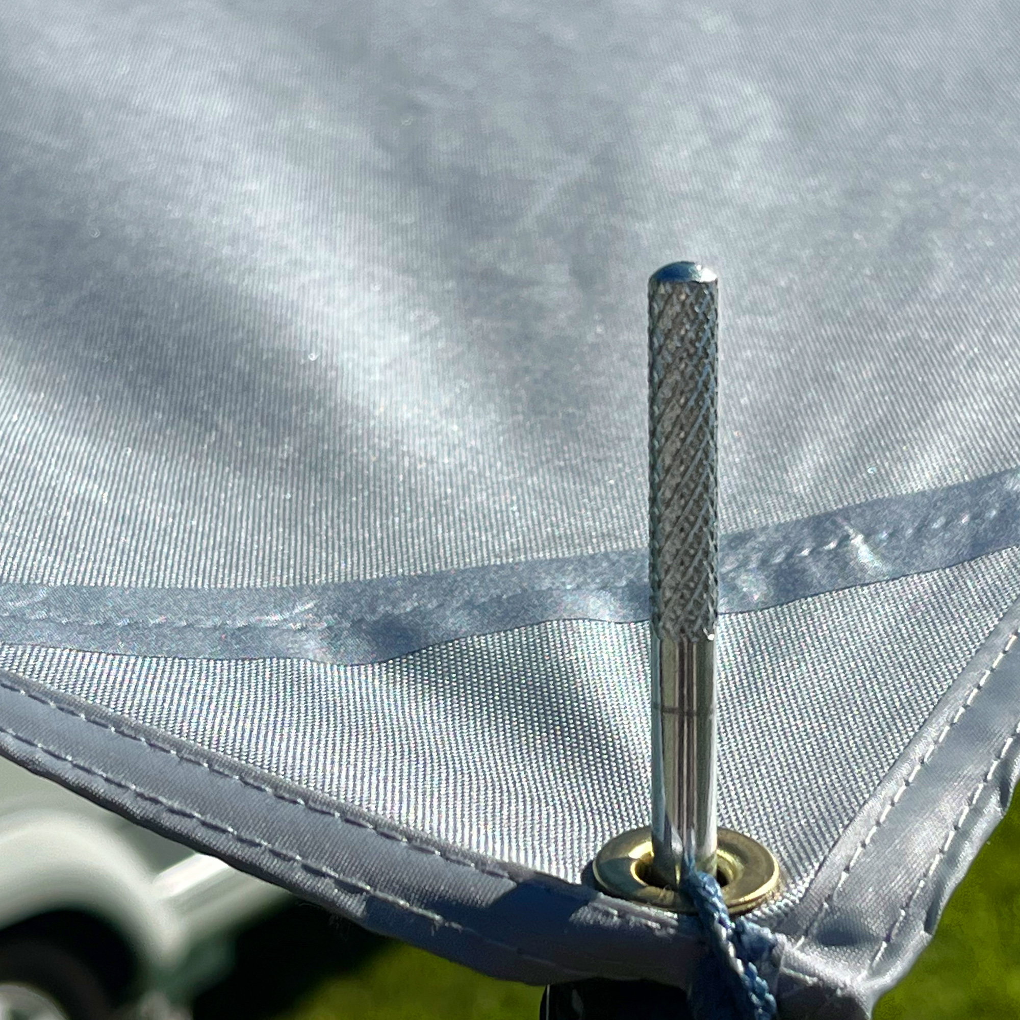 - Installazione rapida - Il tettuccio parasole è dotato di un doppio keder con diametro di 5 mm e 7 mm e viene inserito nella fascia keder del veicolo. Il tettuccio si monta e si tende utilizzando i 3 pali telescopici in alluminio, le cinghie di tensione e i picchetti per tende