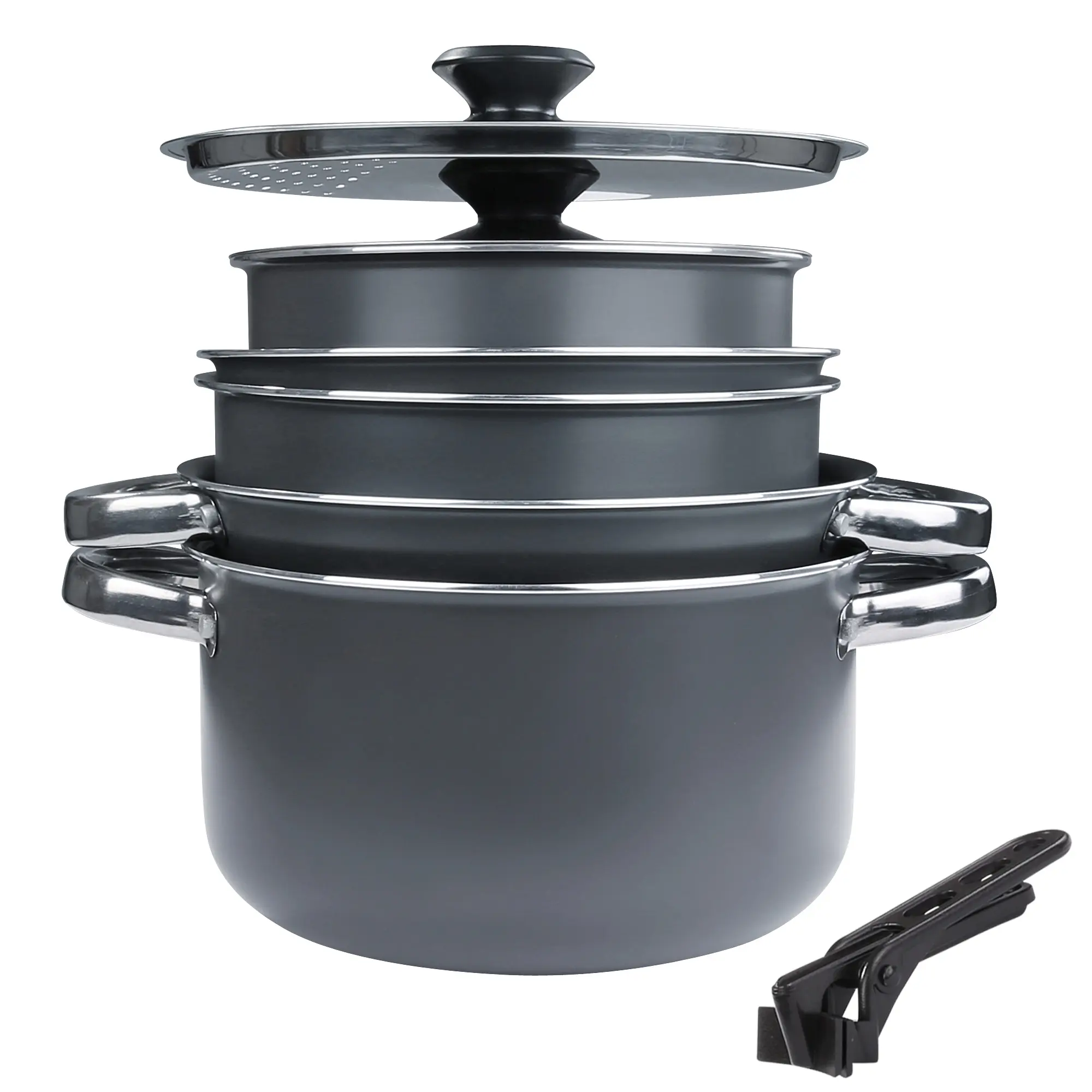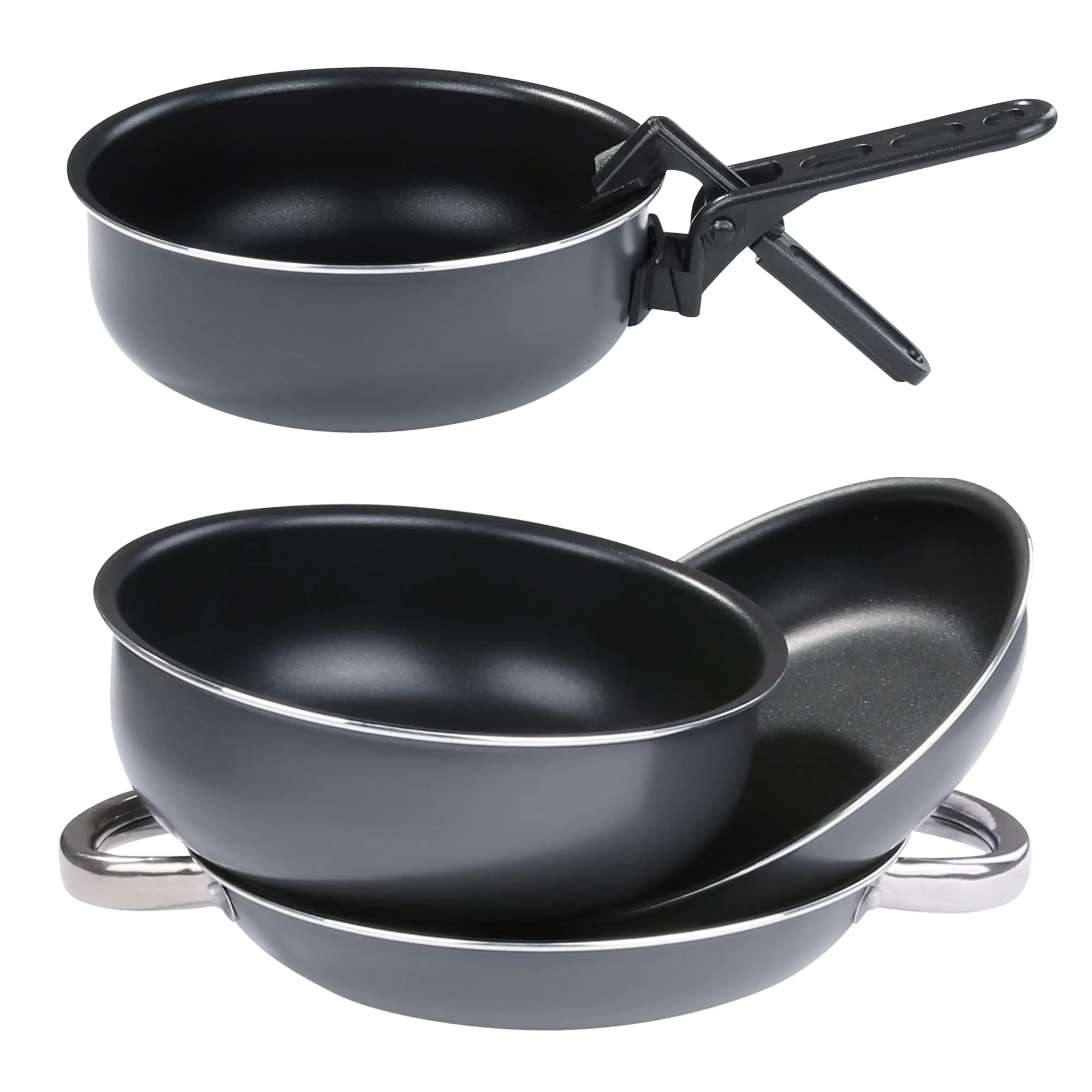 - Adatto per fornello elettrico, fornello a gas, piano cottura a più fuochi, piano cottura a gas, piastra, grill e fuoco aperto. Contenuto della fornitura: 3 pentole, 2 padelle, 2 coperchi, 1 manico, 1 sacchetto di imballaggio
