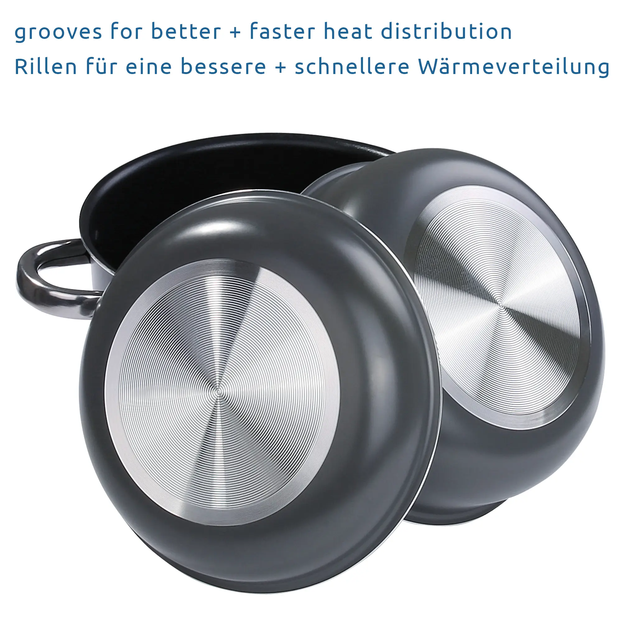 Le scanalature sul fondo delle pentole forniscono una superficie di contatto ampliata e quindi una distribuzione efficiente del calore, riducendo il tempo di cottura. Il set è adatto per fornelli elettrici, fornelli a gas, fornelli a più fuochi, fornelli a gas, piani cottura, griglie e fuochi aperti.