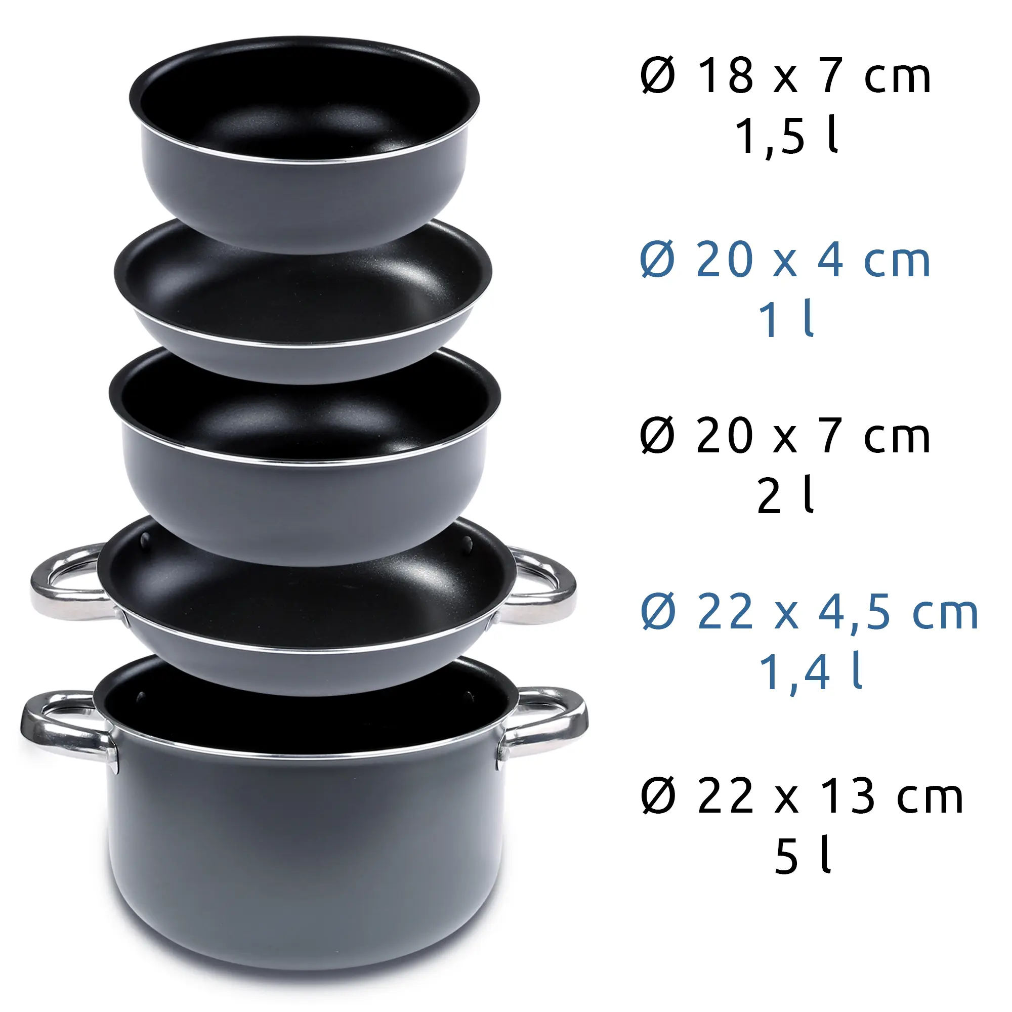 - Set di cottura da 9 pezzi: Pentola da 5 litri con manici, pentola da 2 litri, pentola da 1,5 litri, padella da 22 cm con manici (1,4 litri), padella da 20 cm (1 litro), 2 coperchi con fori per versare, 1 manico in ABS, 1 sacchetto di imballaggio
