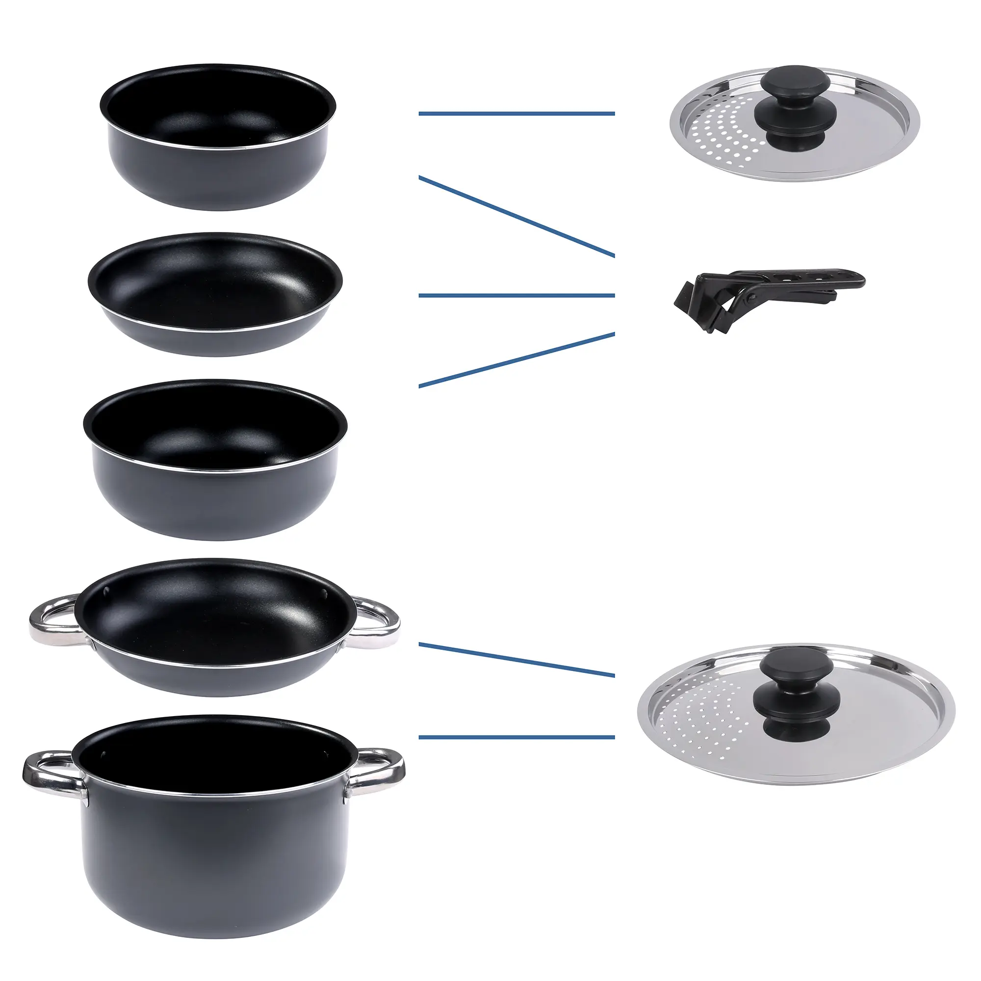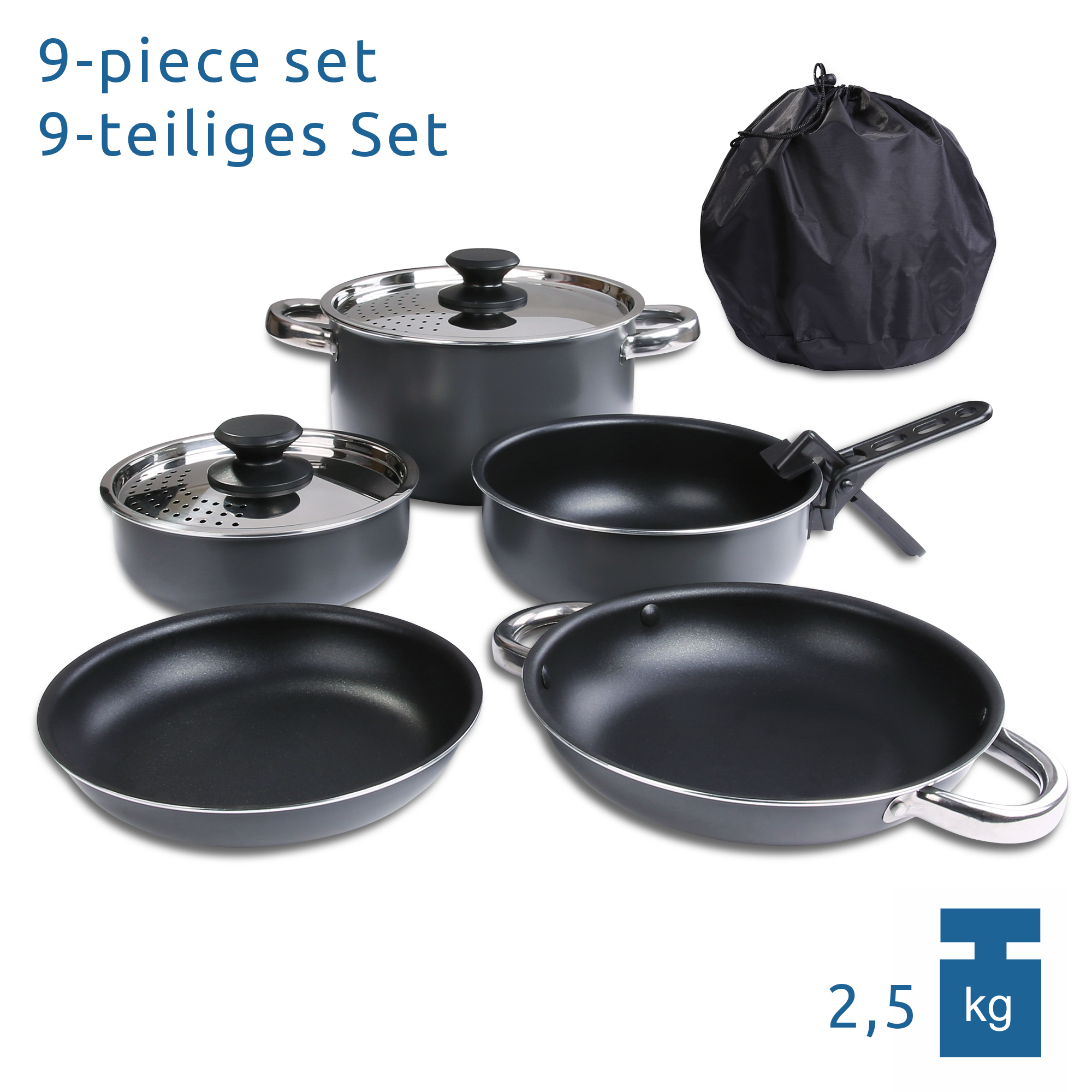 Set: 9 pezzi - 3 pentole, 2 padelle, 2 coperchi, 1 manico, 1 sacchetto di imballaggio
