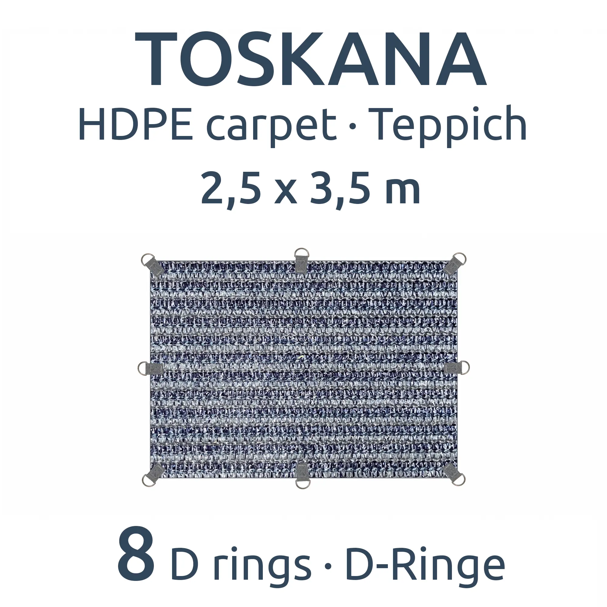 - Anillas en D en lugar de ojales – Los ojales tradicionales se rasgan fácilmente y pueden dañar la alfombra. Por eso, la alfombra Toskana está equipada con resistentes anillas en D, cosidas con refuerzo en cada esquina y a lo largo de los bordes para evitar desgarros