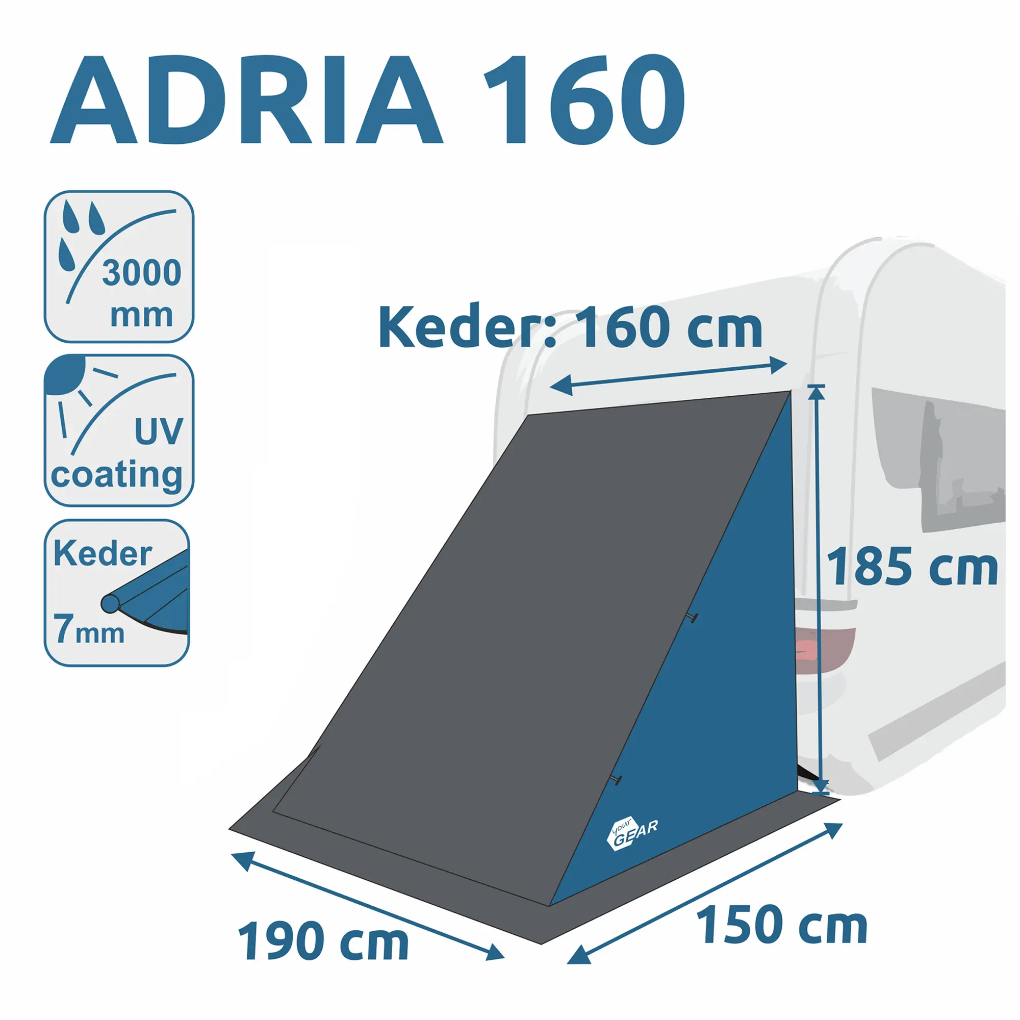 - 3 Größen für jede Wohnwagenbreite und Kederschienenlänge. Adria 140 (Kederschiene 140 - 159 cm) - Adria 160 (Kederschiene 160 - 179 cm) - Adria 180 (Kederschiene ≥ 180 cm). Befestigung am Wohnwagen mit 7mm Keder. Anbauhöhe ca.185 cm