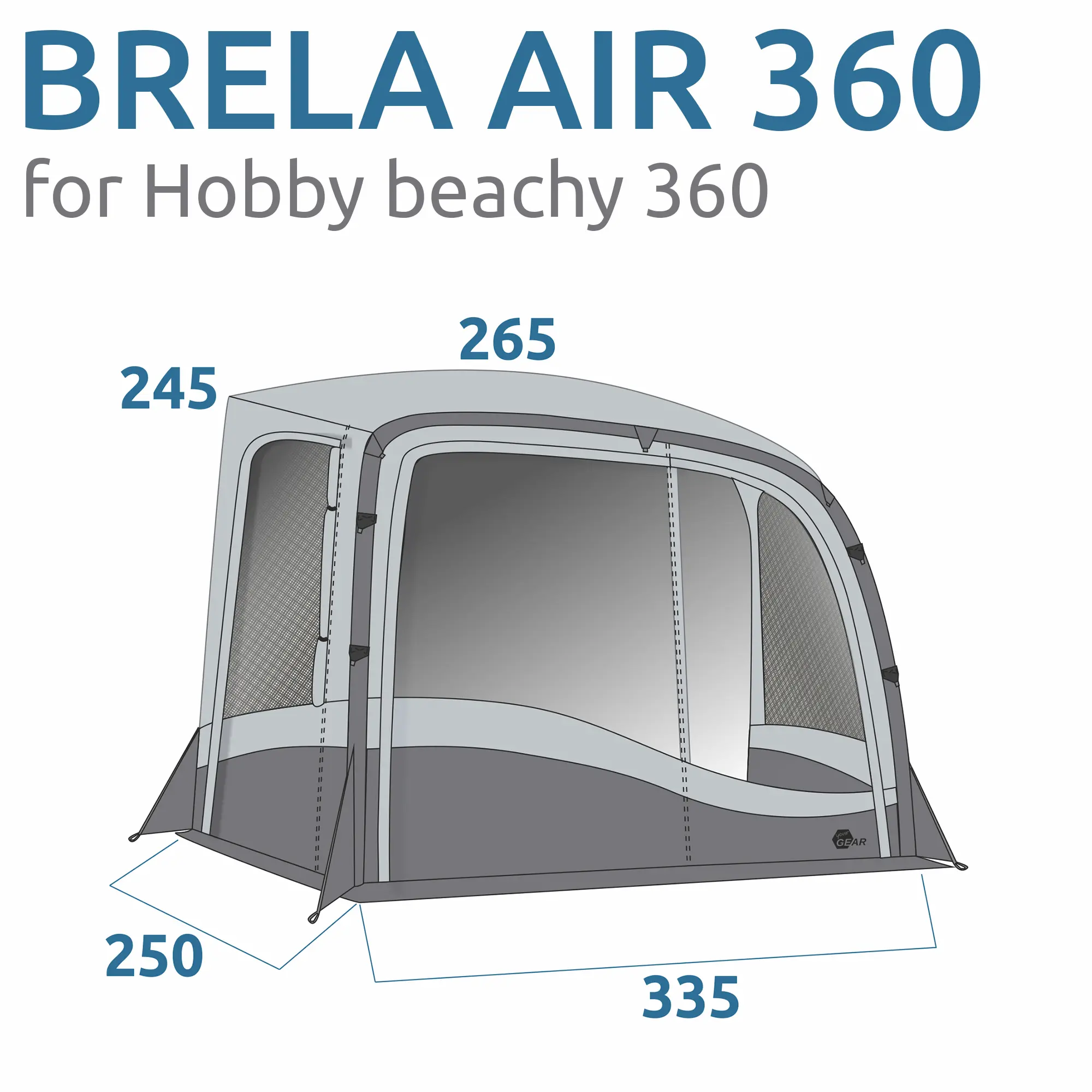 - Brela Air 360 - passend für Hobby beachy 360: Breite 335 cm - Tiefe: 250 cm - Anbauhöhe: 245 / 265 cm - Nutzfläche: ca. 8,4 m² - Transporttasche: 85 x 38 x 33 cm - Gewicht 13,3 kg