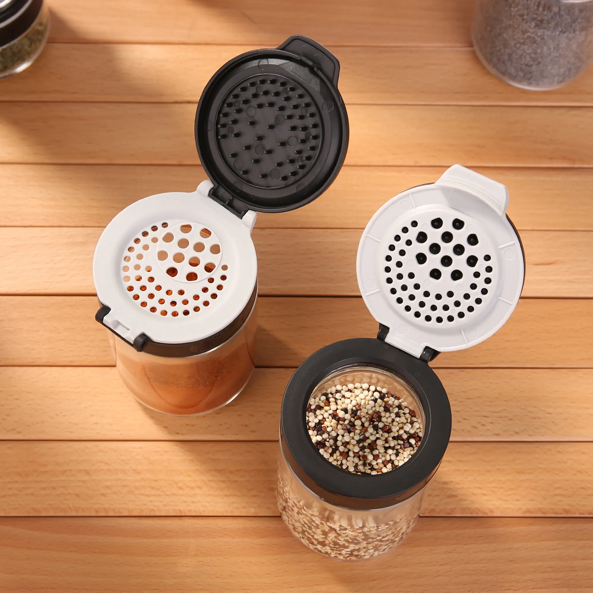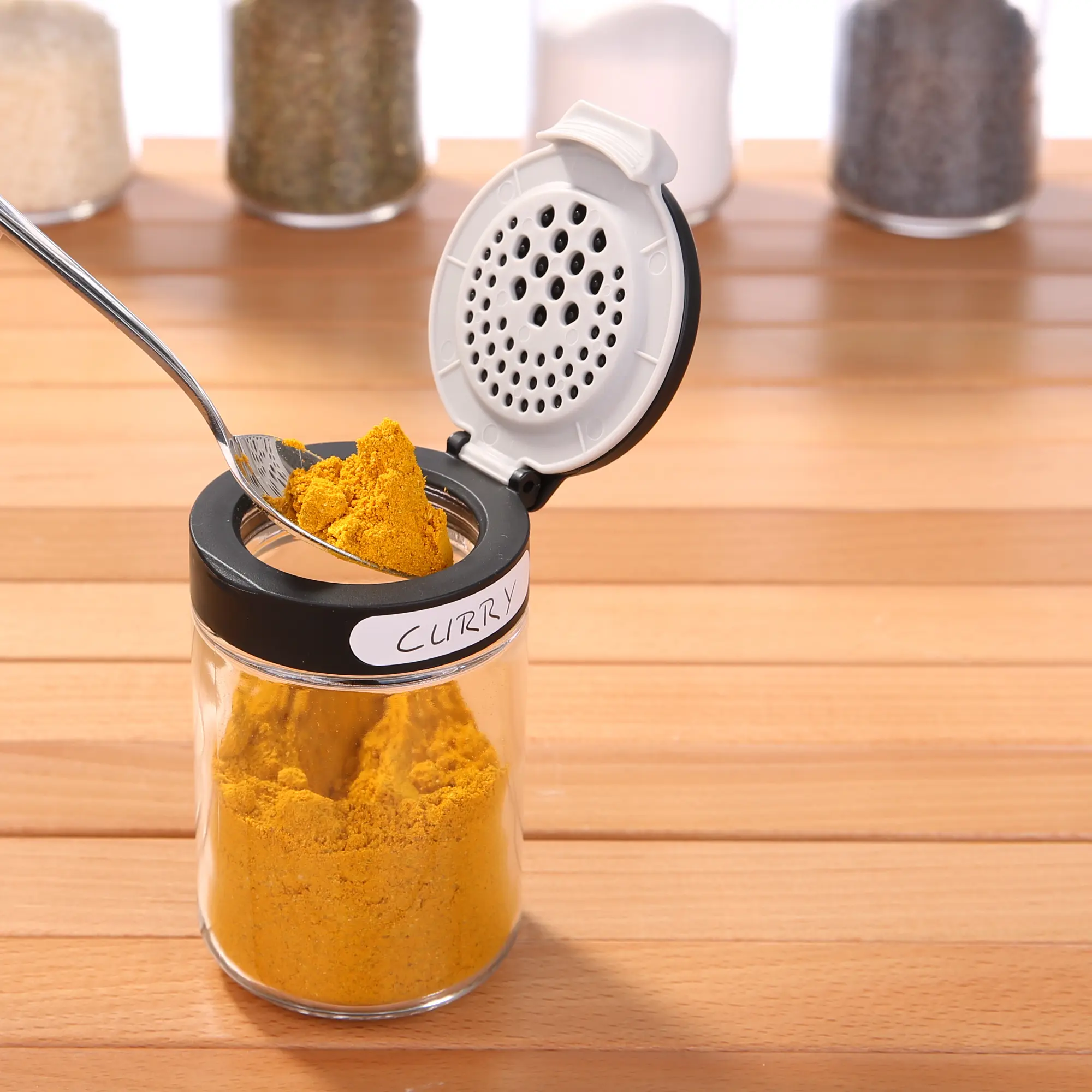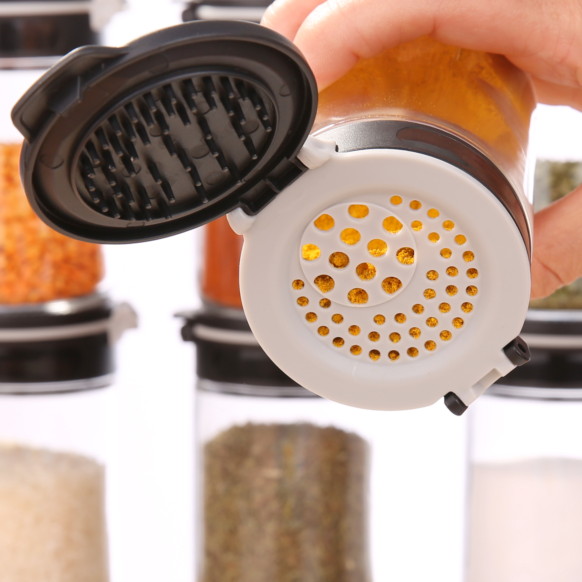 Das besondere der Gewürzgläser ist der innovative und funktionale Deckel. Dieser 3-teilige Deckel bietet ein komfortables Befüllen und Entnehmen Ihrer Gewürze. Der zweite Verschluss bietet zwei unterschiedliche Streuöffnungen. Beide Seiten lassen sich bequem mit einer Hand öffnen.