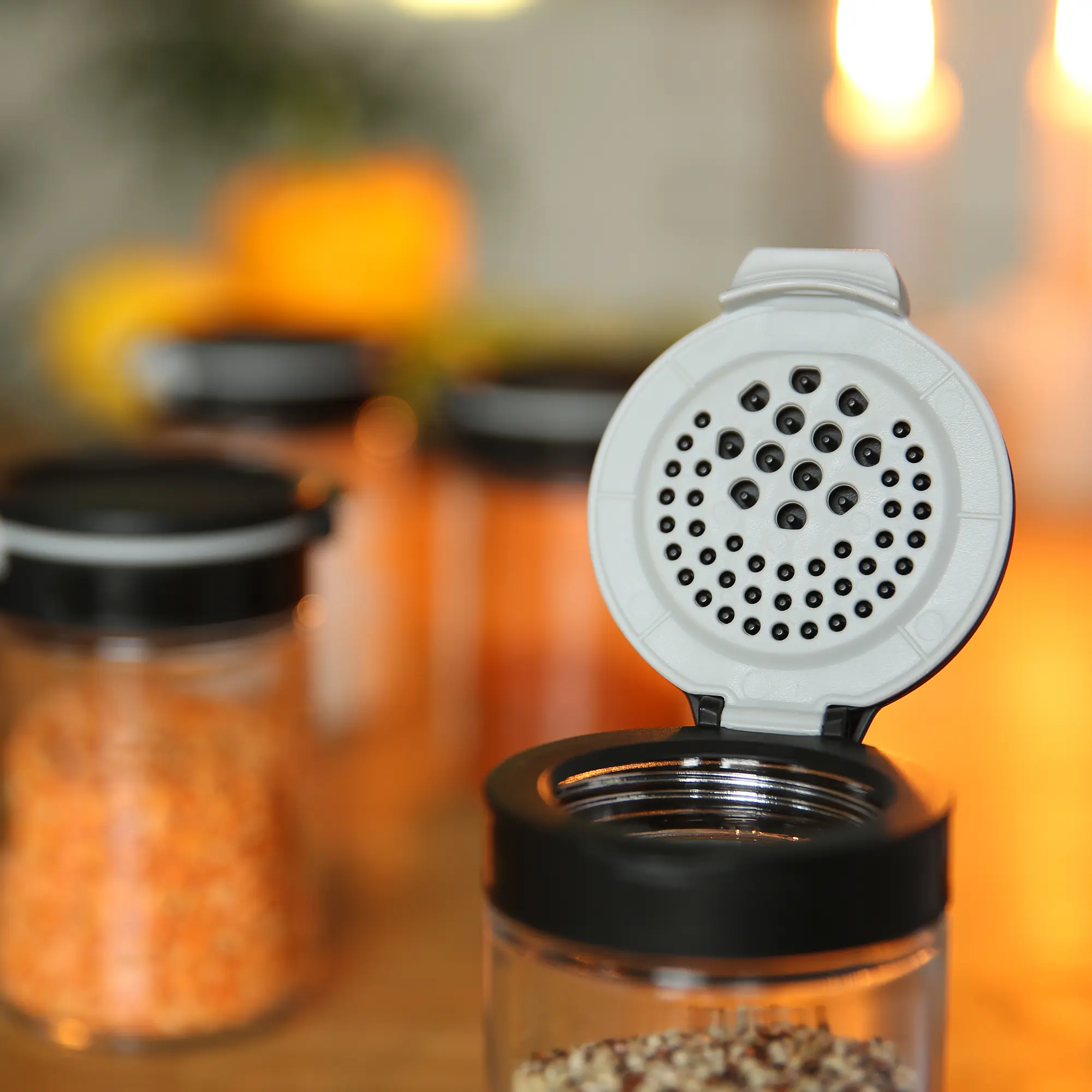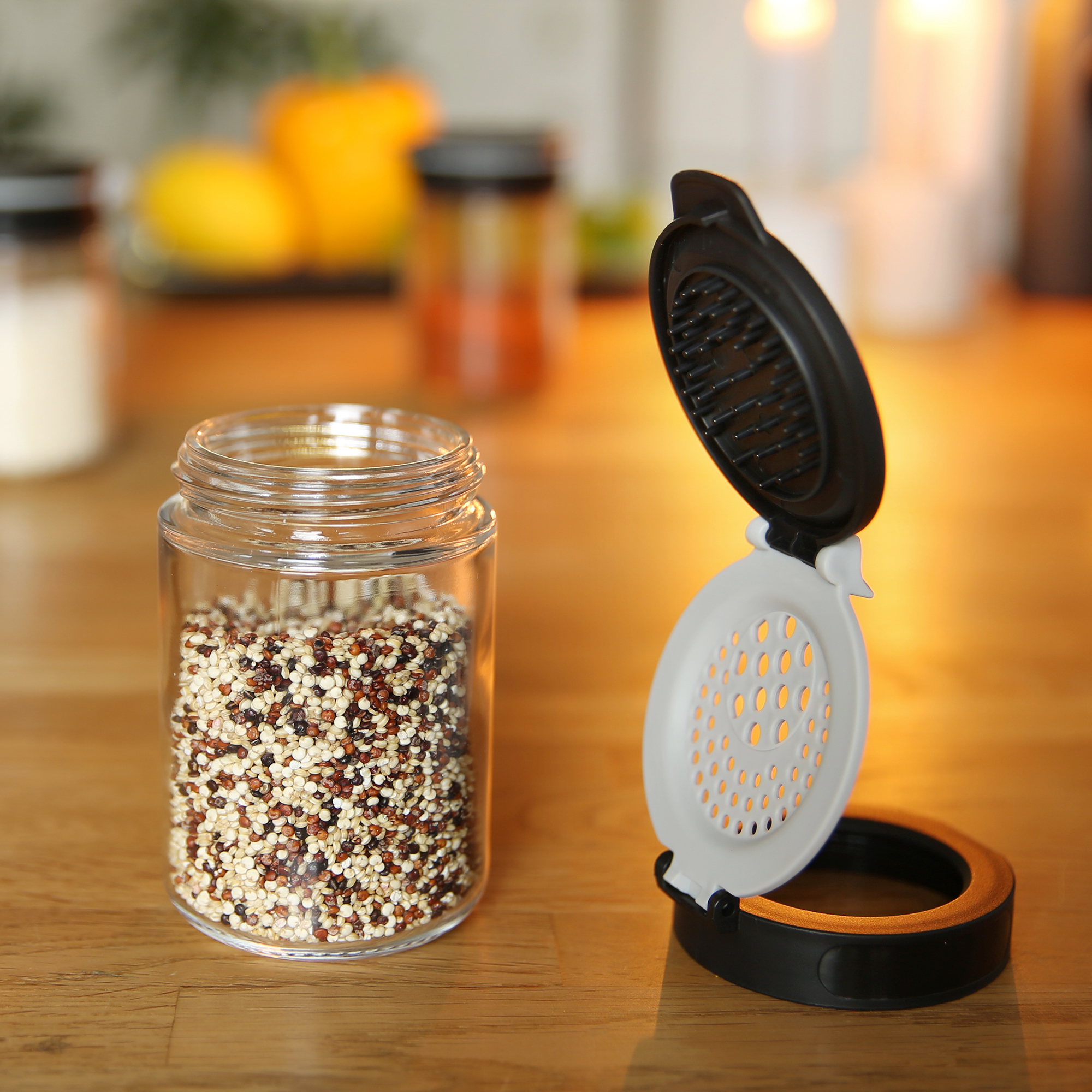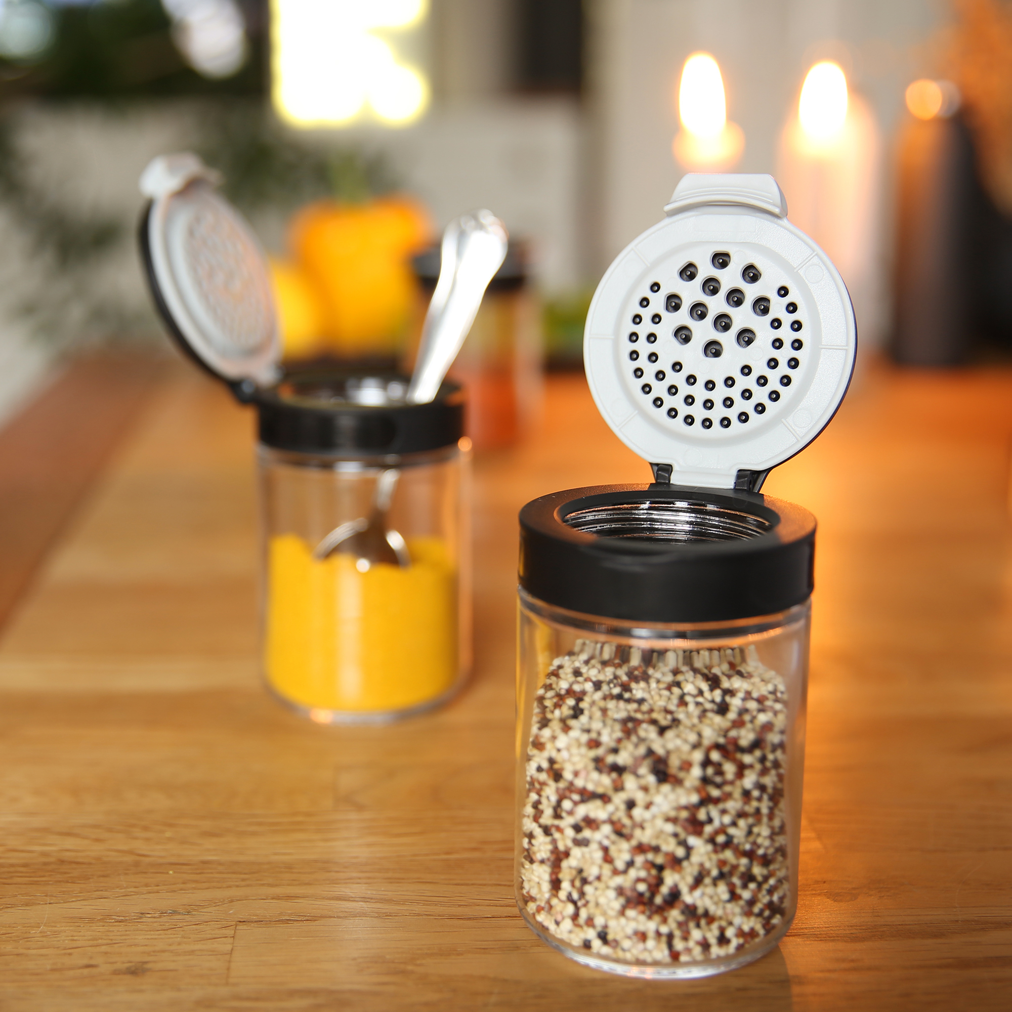 Das besondere der Gewürzgläser ist der innovative und funktionale Deckel. Dieser 3-teilige Deckel bietet ein komfortables Befüllen und Entnehmen Ihrer Gewürze. Der zweite Verschluss bietet zwei unterschiedliche Streuöffnungen. Beide Seiten lassen sich bequem mit einer Hand öffnen.