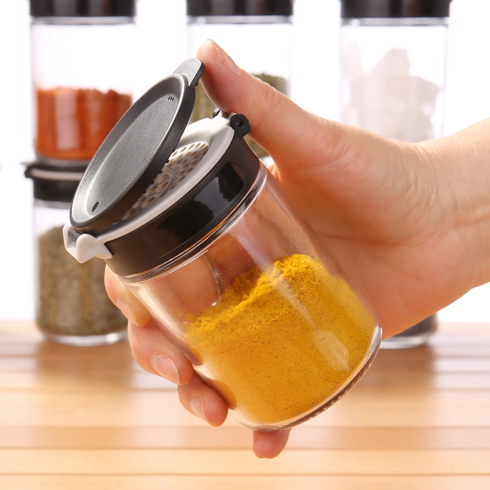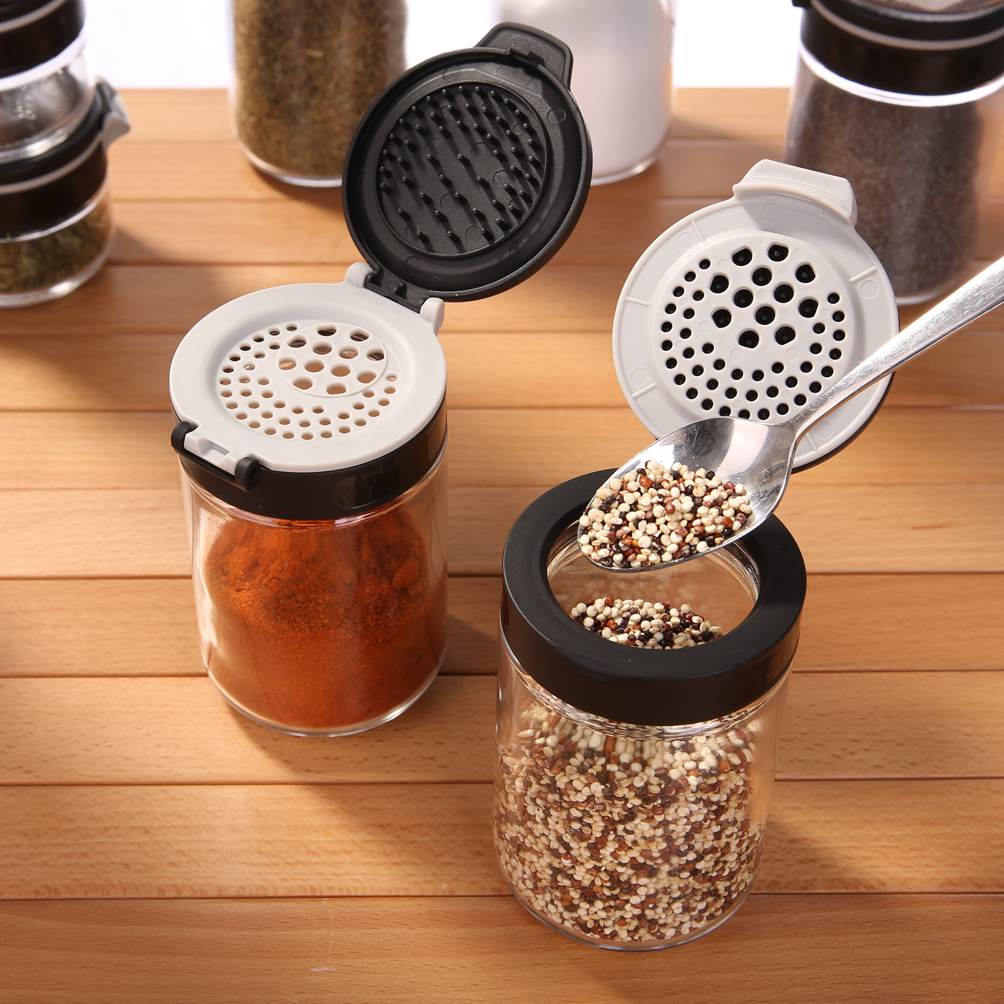 - Optimale Gewürzaufbewahrung: 10 Gläser in Lebensmittelqualität mit funktionalem Doppel-Klappdeckel, der sich bequem mit einer Hand öffnen lässt