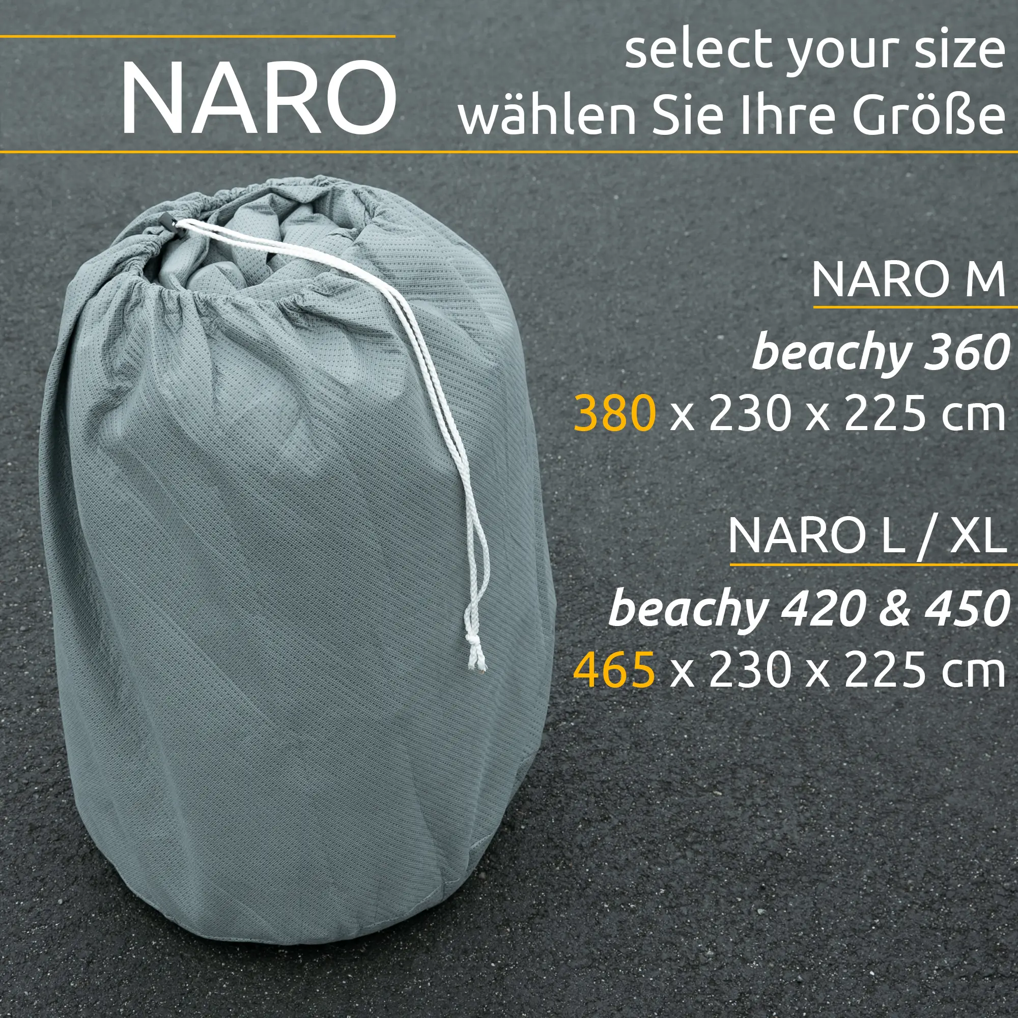 Naro bietet den passgenauen Schnitt für Ihren Hobby beachy. Die Abdeckplane wird in 2 Größen angeboten: