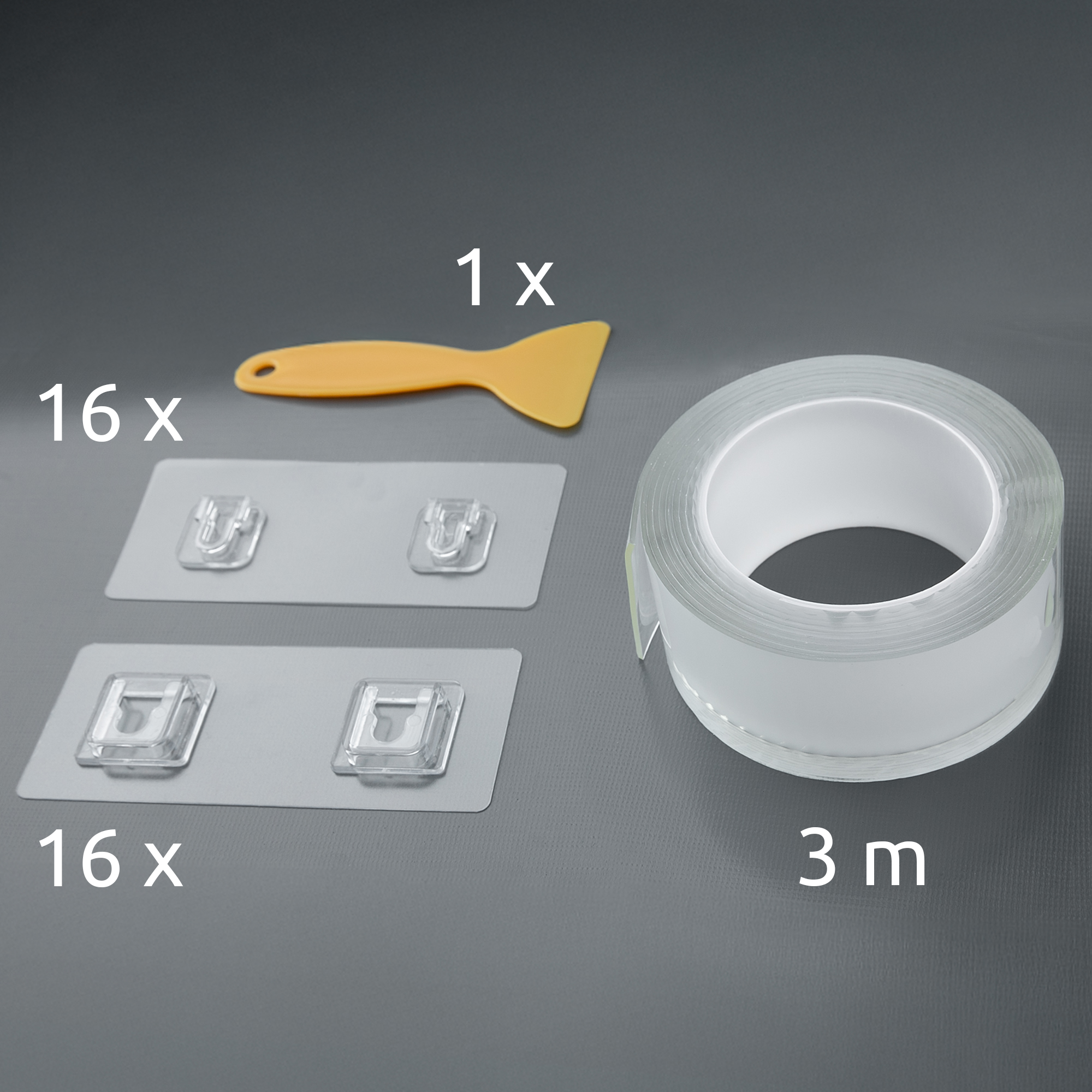 2) Doppelseitiges Klebeband (3 m - rückstandsfrei wieder entfernbar) Für eine dauerhafte Befestigung kann das beiliegende, extra starke Klebeband verwendet werden. Ideal für eine feste, belastbare Montage.