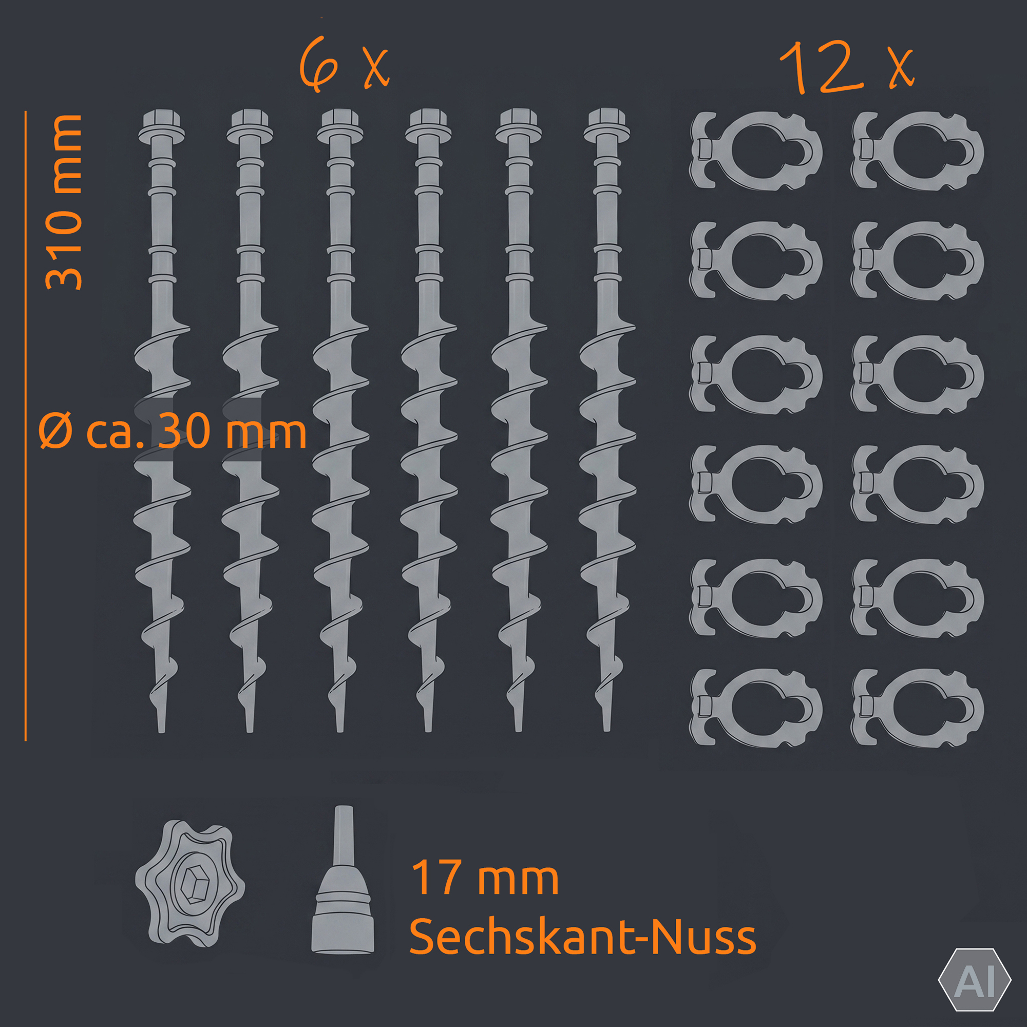 - KOMPLETT-SET: Profi-Zubehör für Wohnwagen & Wohnmobil. Enthält 6 XXL Erdnägel (nur 42 g / Stück), 12 Spezial-Haken, eine 17er Sechskant-Nuss für den Akkuschrauber sowie einen Handschraubsockel zum manuellen Eindrehen