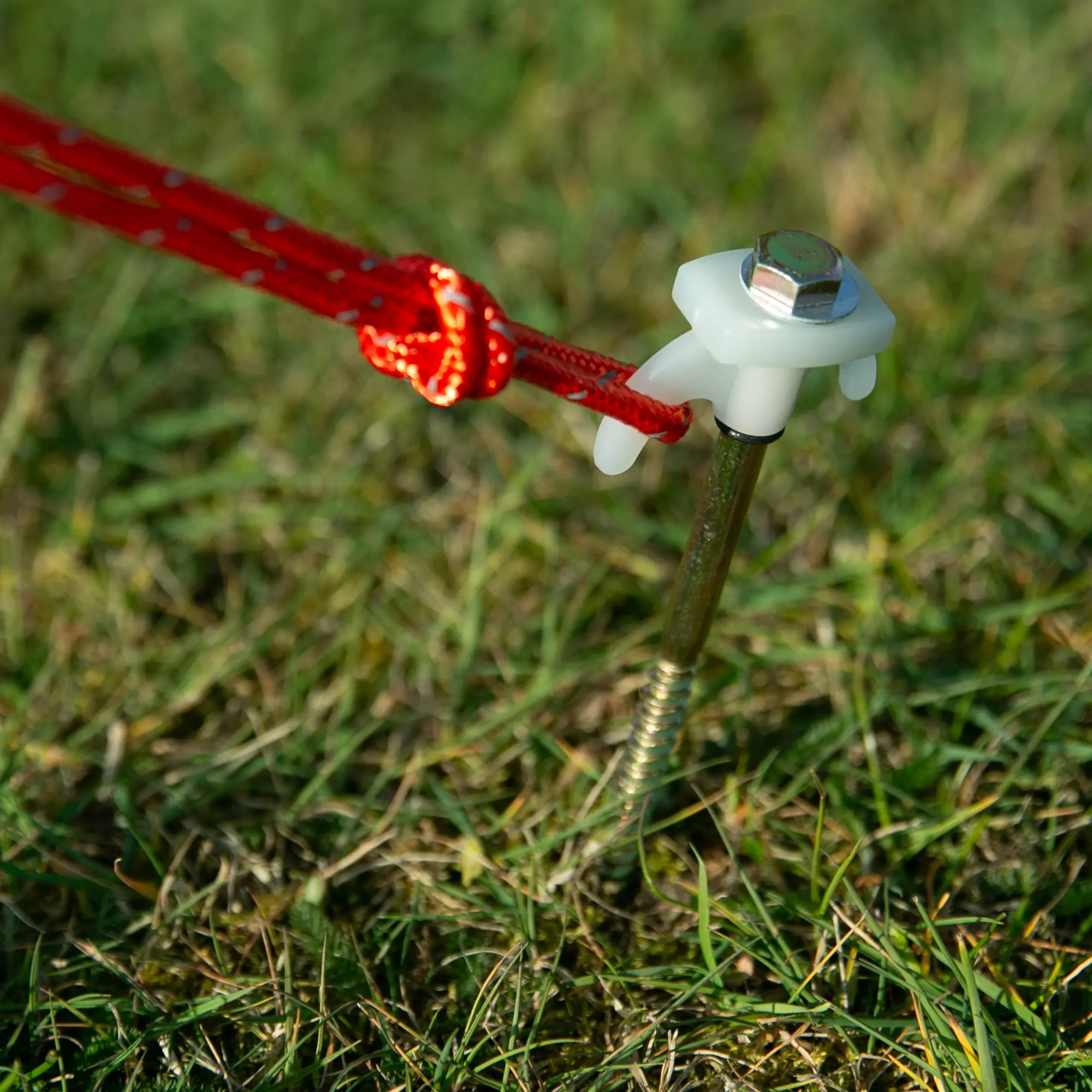 - Glow-in-the-Dark – Jeder Schraubhering besitzt einen fluoreszierenden Kunststoffkopf mit 2 Haken zur Befestigung der Abspannleine sowie einen Gummiring um ihn in Position zu halten