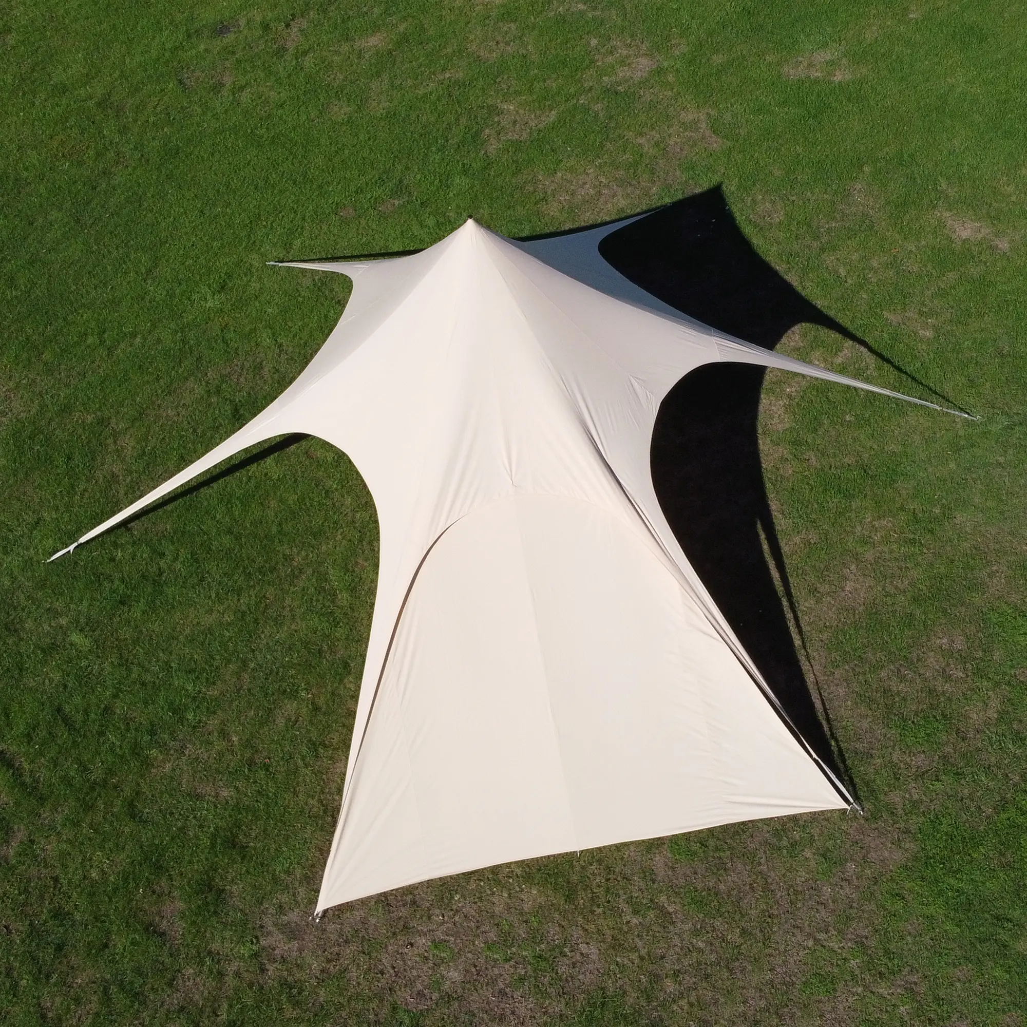 Das Sonara 10 Sternzelt wird auf einer Fläche von etwa 75 m² aufgebaut. Das Sternzelt mit 6 Bodenabspannungen hat einen Durchmesser von ca. 10 m und eine Gesamthöhe von 4 m. Das Pyramidendach wird mit einer extrem stabilen, 38 mm Aufstellstange aufgerichtet. Sowohl der Aufbau als auch der Abbau sind dank der zentralen Aufstellstange sehr einfach und schnell zu bewältigen. Eine extra große Transporttasche ermöglicht ein stressfreies Verpacken des Zeltes.