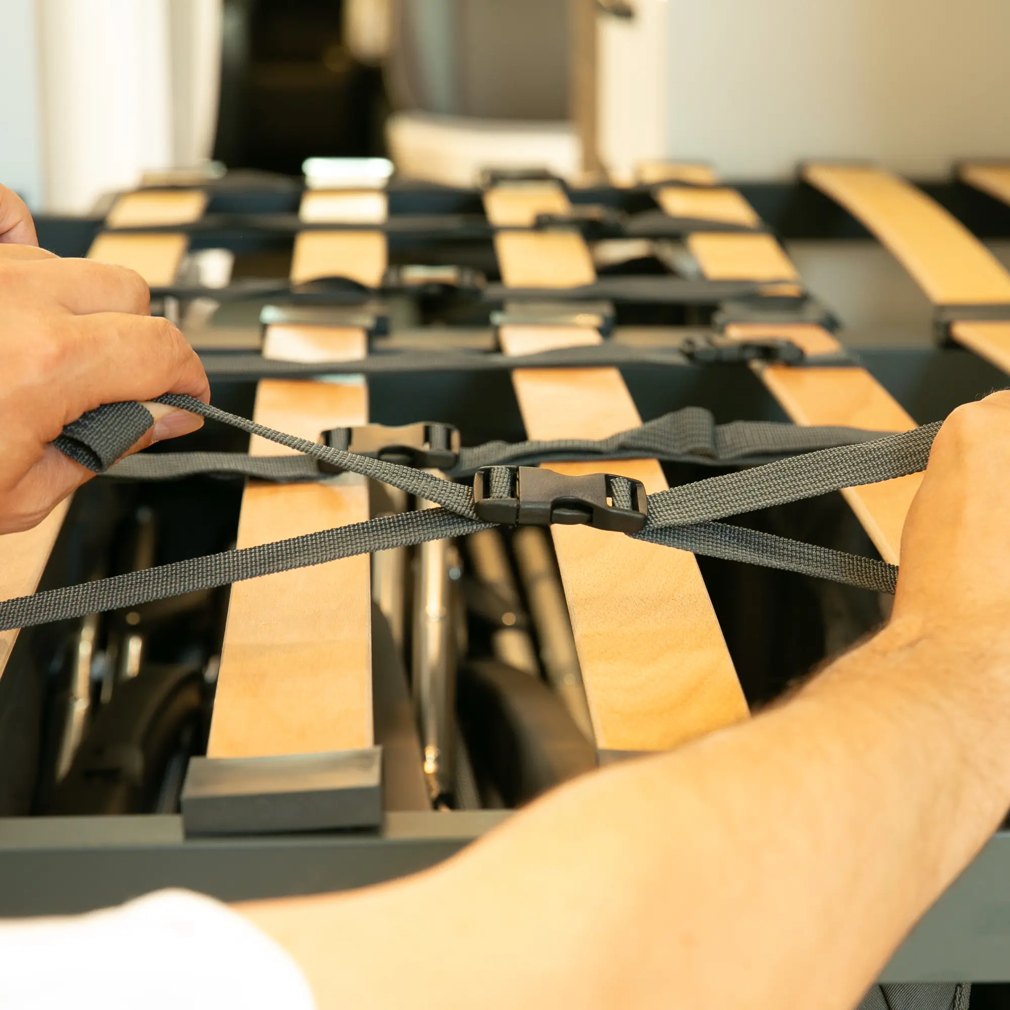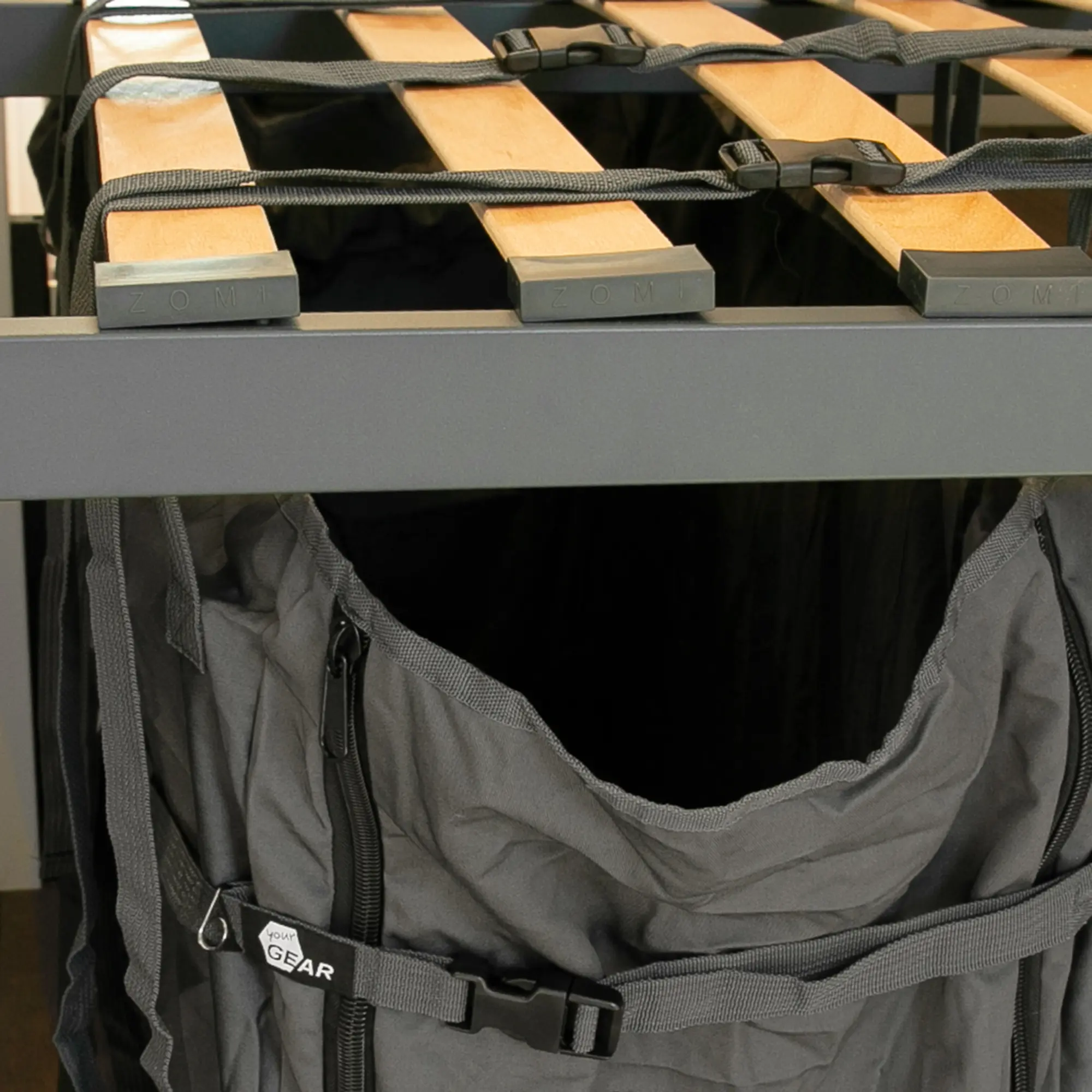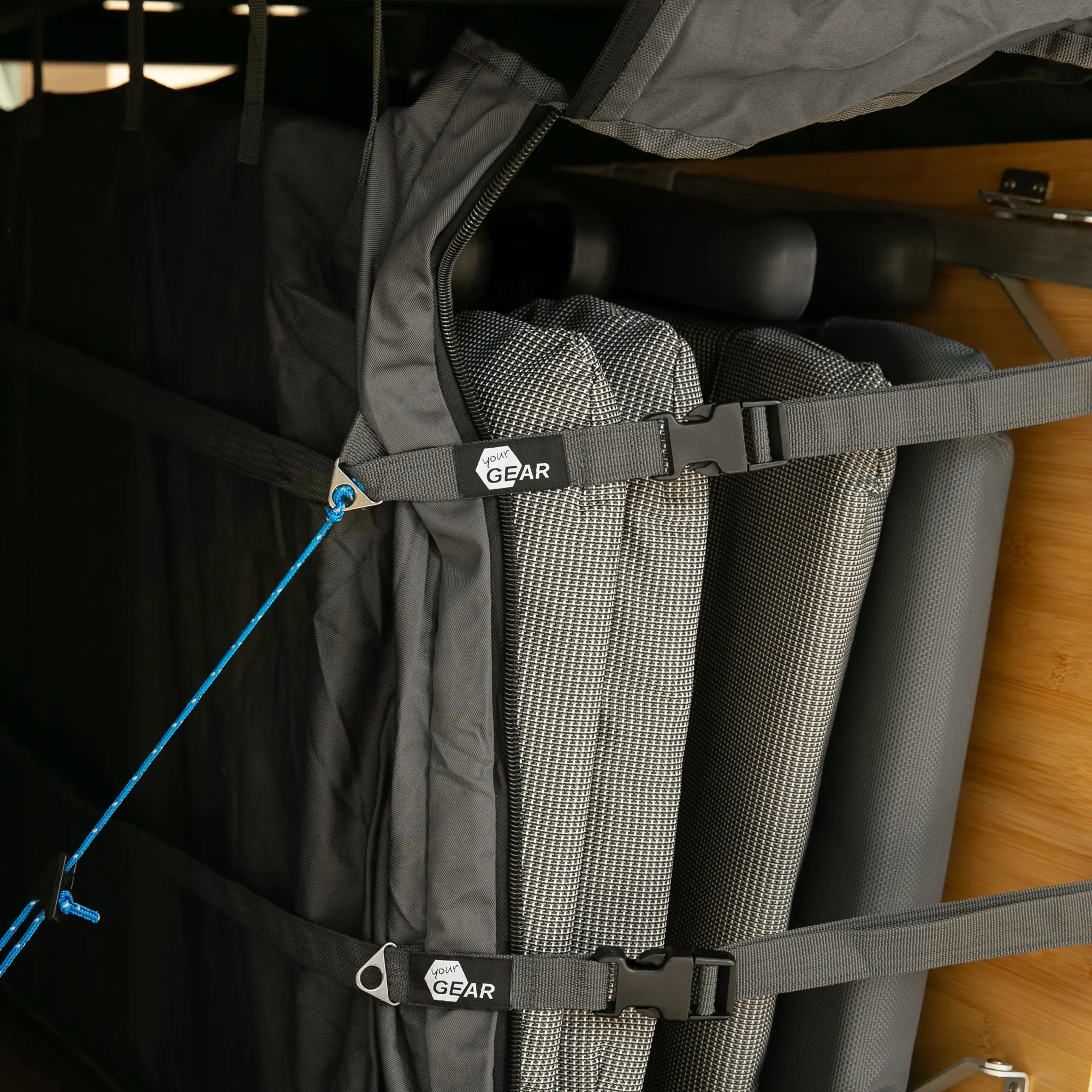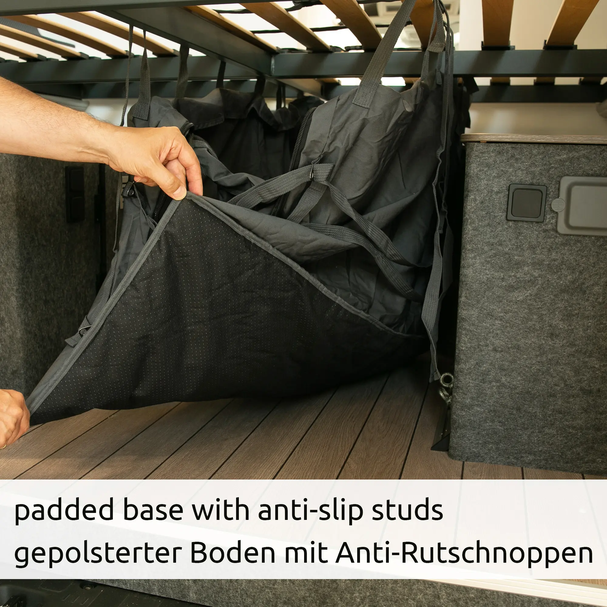 - Einfache, flexible Montage: 6 verstellbare Gurtbänder zur Befestigung am Lattenrost. Vertikal montierbar (65-110 cm Höhe) – ideal für die Heckgarage im Campervan und Kastenwagen