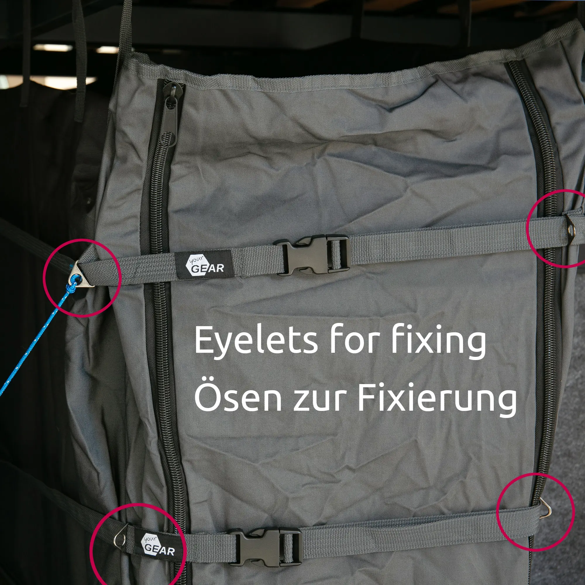 Zusätzliche Metall-D-Ringe an den Seiten bieten weitere Befestigungsmöglichkeiten und unterstreichen die durchdachte Funktionalität der your GEAR Gepäckraumtasche Bozen. Ob links, mittig oder rechts montiert – diese transportable Stauraumtasche ist die perfekte Investition für eine organisierte, sichere und ruhige Fahrt. Erleben Sie maximale Transportsicherheit für entspannte Campingreisen!