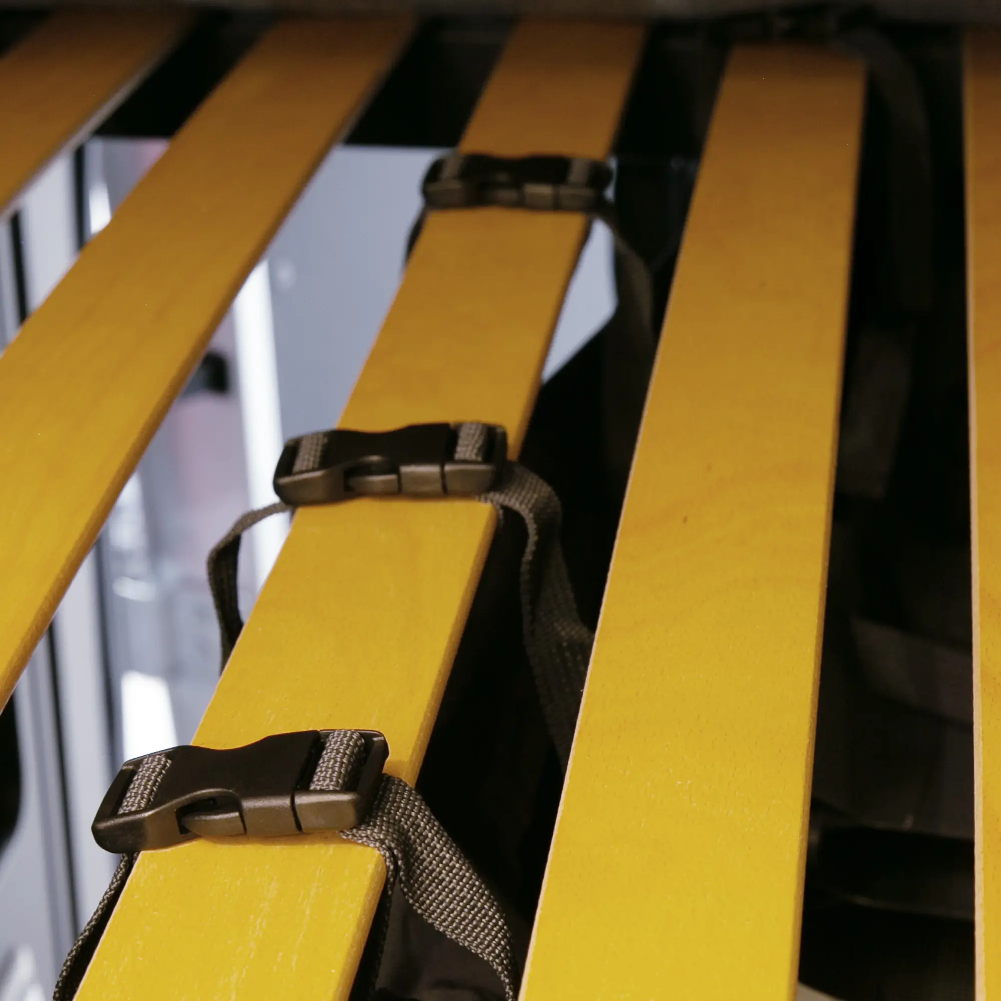 Das intelligente Befestigungssystem aus 16 verstellbaren Gurten mit hochwertigen Schnallen und zusätzlichen Metall-D-Ringen sorgt für eine bombenfeste Montage an nahezu jedem Lattenrost. Sechs stabile Gestänge im Boden der Tasche garantieren, dass nichts durchhängt – auch nicht bei voller Beladung auf unebenen Straßen. So reisen Sie immer sicher und ohne störende Geräusche.