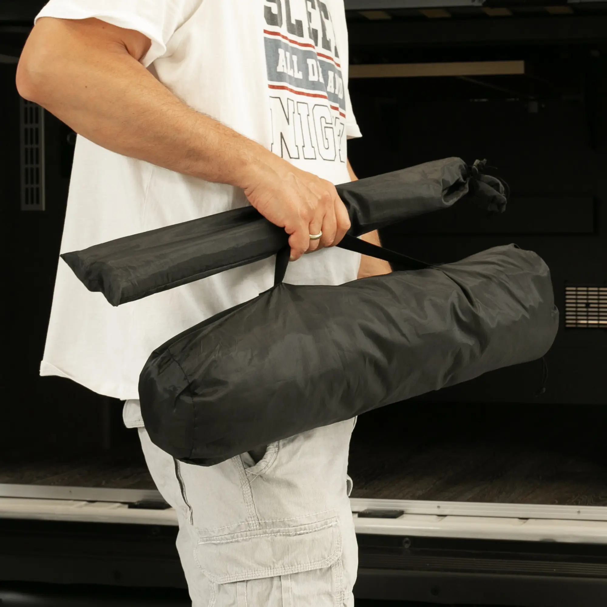 Unsere Transport- und Stauraumtasche ist 115 x 100 x 50 cm groß und wurde speziell für die Bedürfnisse von Campern entwickelt. Durch die horizontale Montage bleibt der Fahrzeugboden frei, während Ihre Campingmöbel sicher und sauber über dem restlichen Gepäck schweben. Die große Reißverschluss-Öffnung an der Vorderseite ermöglicht Ihnen jederzeit einen schnellen und unkomplizierten Zugriff auf den Inhalt.