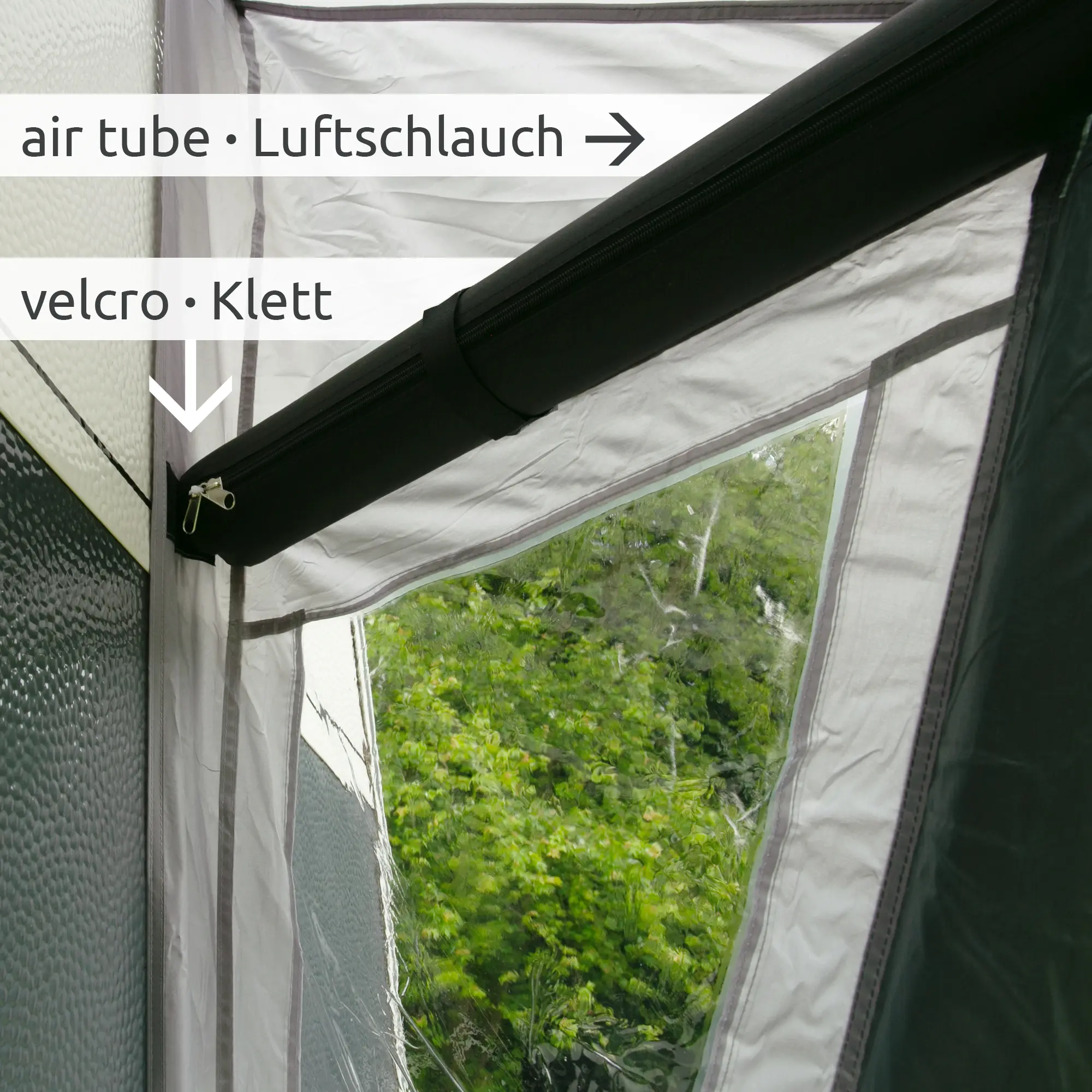 Schneller Aufbau - aufblasbares Vorzelt mit 4,3 mm, 6,2 mm und 7 mm Keder zum Montage an der Kederschiene des Fahrzeugs oder der Markise. Einziehen, aufpumpen, abspannen, fertig
