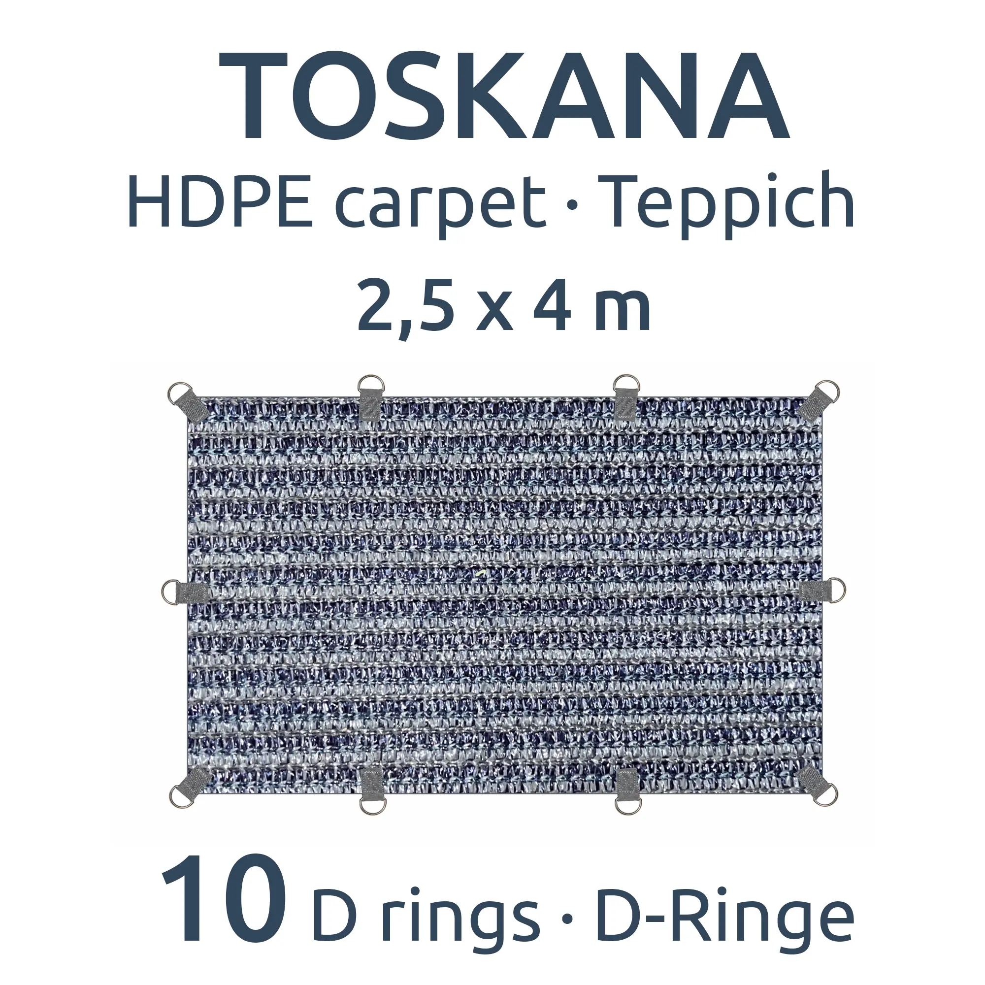 - D-Ringe statt Ösen - Einschlagösen reißen schnell aus und beschädigen den Teppich. Beim Toskana Teppich wurden daher stabile D-Ringe mit einer Verstärkung an jeder Ecke und entlang der Kanten eingenäht, die nicht ausreißen können
