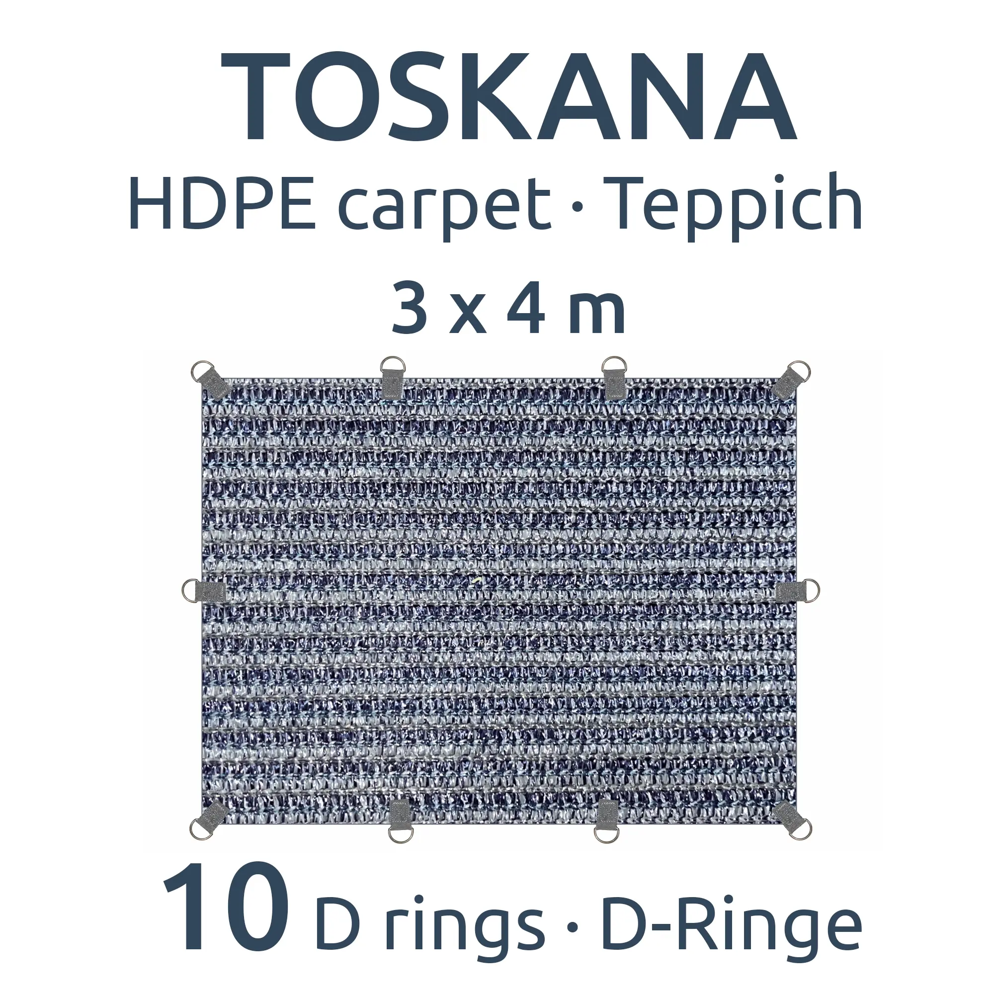 - D-Ringe statt Ösen - Einschlagösen reißen schnell aus und beschädigen den Teppich. Beim Toskana Teppich wurden daher stabile D-Ringe mit einer Verstärkung an jeder Ecke und entlang der Kanten eingenäht, die nicht ausreißen können