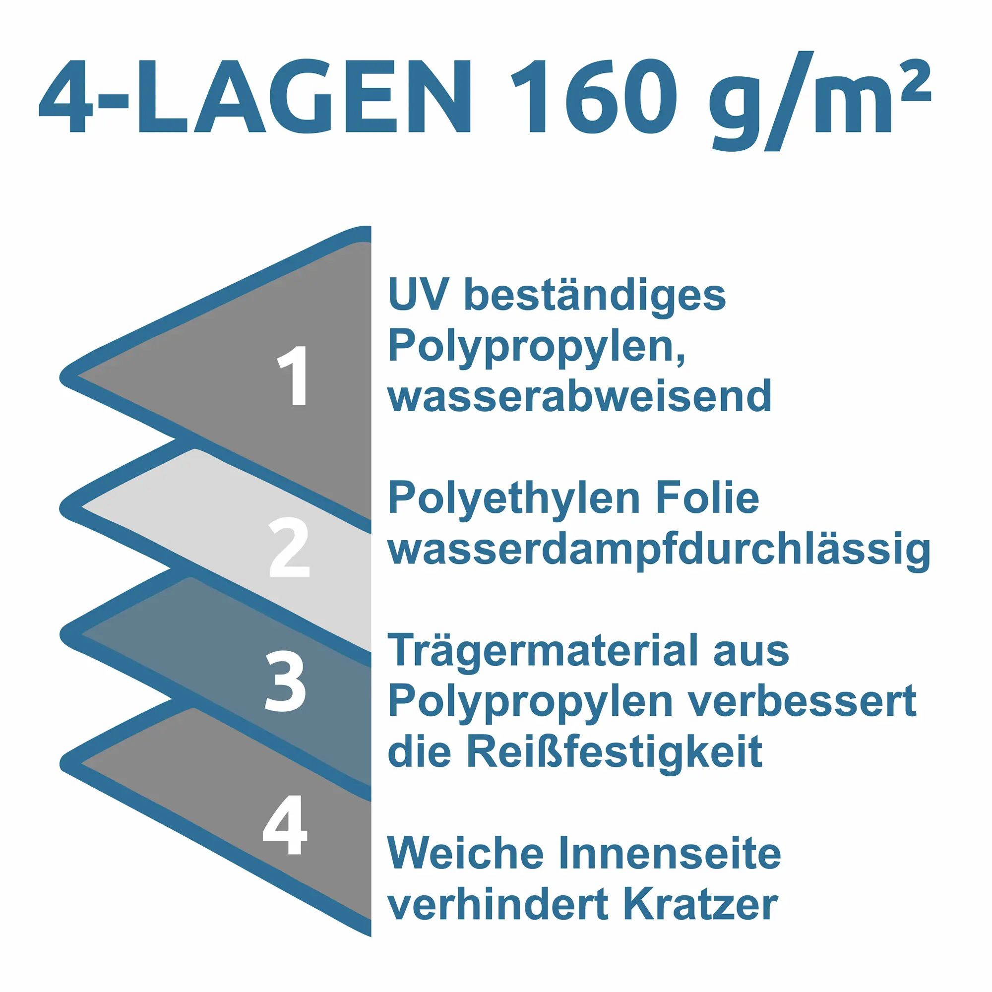 Mit einem Flächengewicht von 160 g/m² bietet die Abdeckung ein ausgewogenes Verhältnis von Robustheit und Flexibilität.