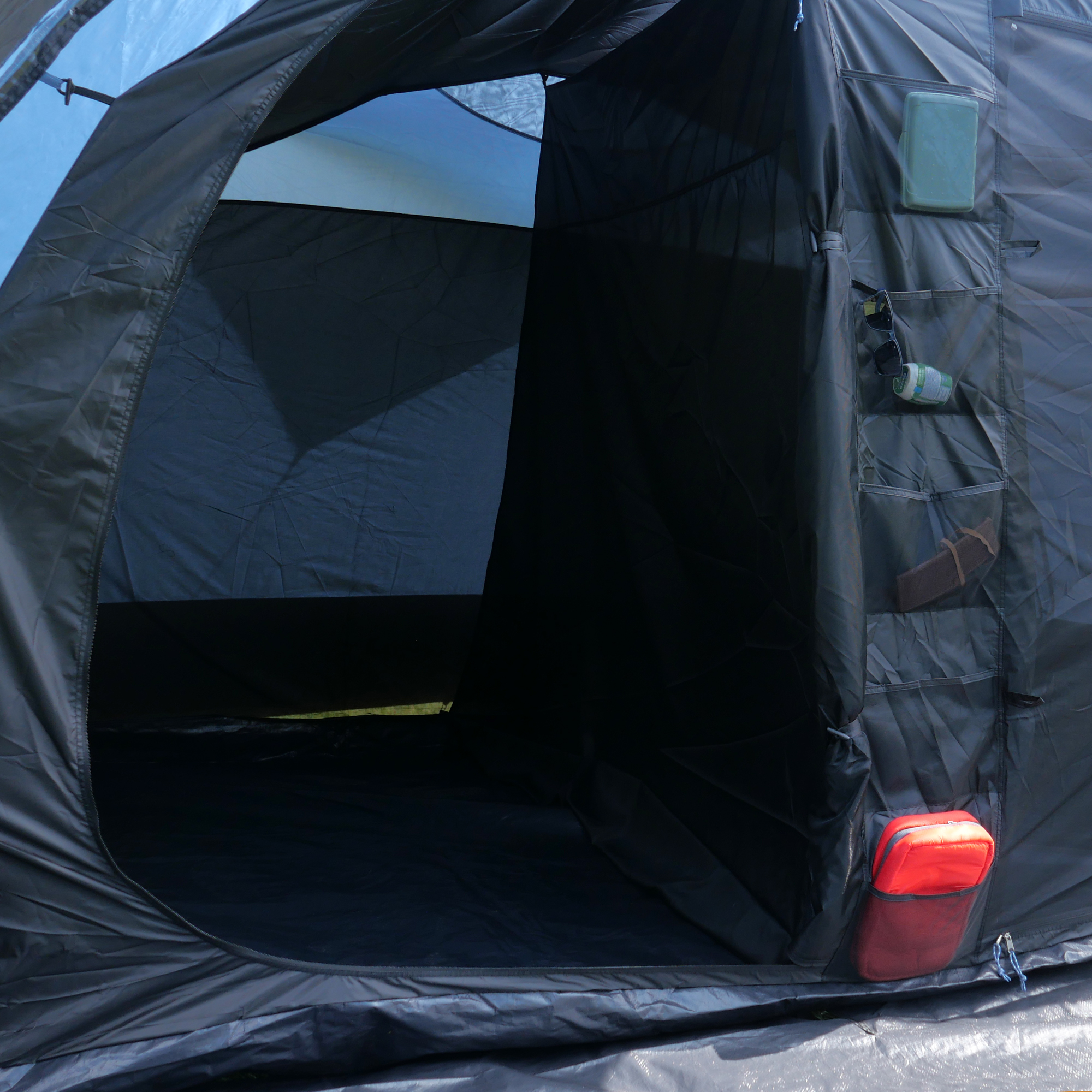 - Campingzelt mit teilbarer Schlafkabine für 6 Mann. Die Eingänge zum Innenzelt besitzen separate Moskitonetztüren für einen Camping-Urlaub frei von Insekten. Zwischen den Türen befindet sich ein Organizer mit Fächern