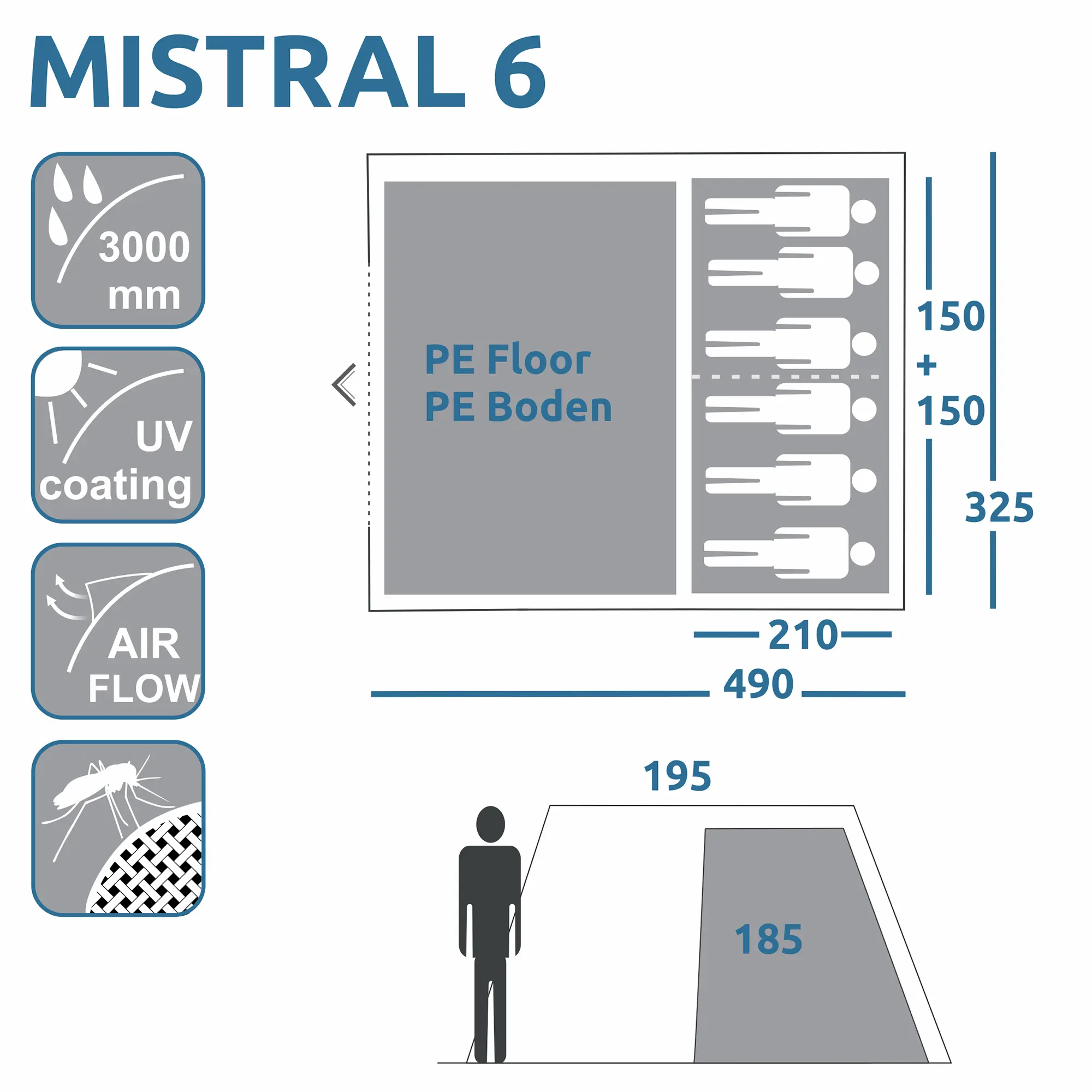 - Maßangaben: 490 x 325 cm, Höhe: 195 cm, Innenzelt: 300 (150 + 150) x 210 cm, Packtasche: 32 x 32 x 68 cm. Lieferumfang: Tunnelzelt, Schlafkabine, Zeltgestänge, Zeltheringe, Abspannleinen, Aufbauanleitung, Pflegeanleitung