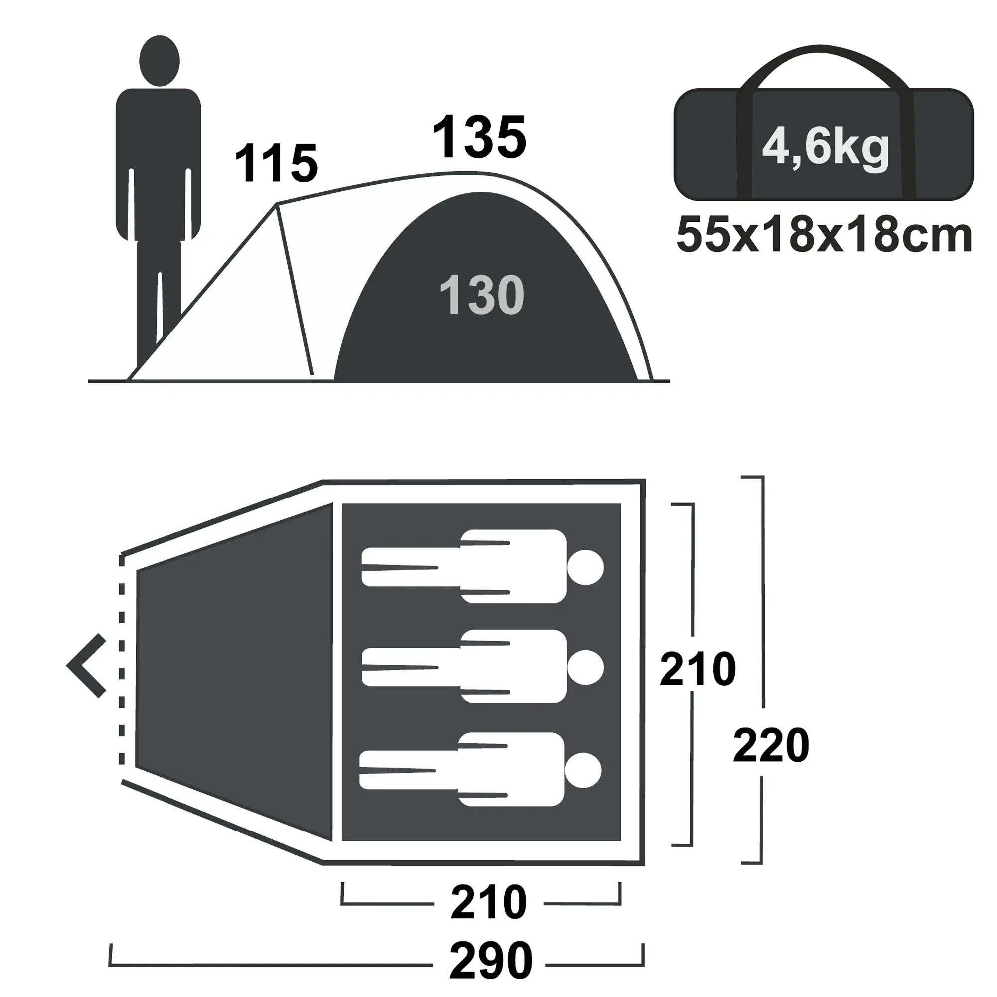 - Maßangaben: 290x220 cm, Höhe: 135 cm, Innenzelt: 210x210 cm, Packtasche: 18x18x55 cm. Lieferumfang: Zelt, Kabine, Gestänge, Heringe, Abspannleinen, Aufbauanleitung
