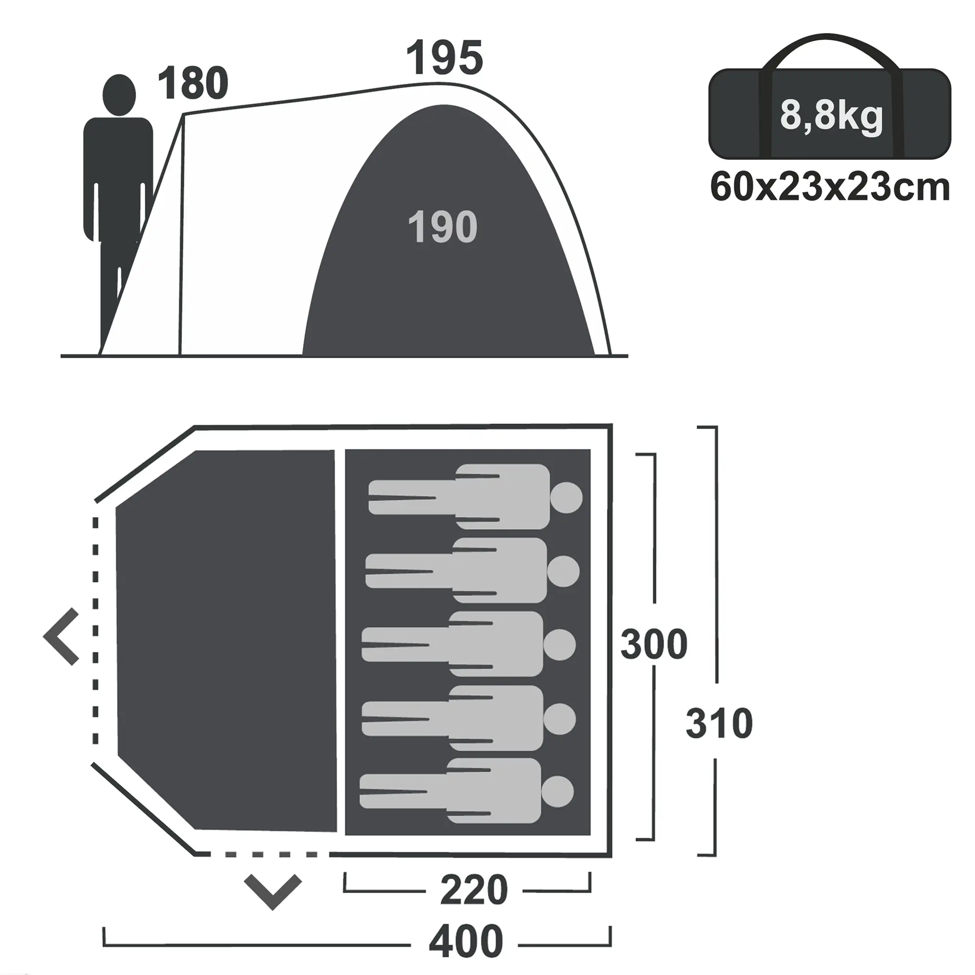 - Maßangaben: 400x310 cm, Höhe: 195 cm, Innenzelt: 300x220 cm, Packtasche: 23x23x60 cm. Lieferumfang: Zelt, Kabine, Gestänge, Heringe, Abspannleinen, Aufbauanleitung