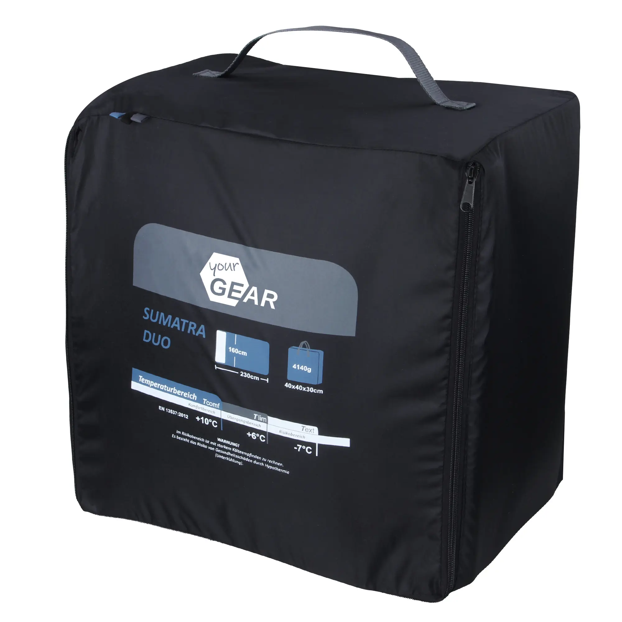 - yourGEAR Campingschlafsack Sumatra Duo. Hochwertiger 2 Personen Baumwoll Schlafsack mit doppellagiger Füllung. Getesteter Temperaturbereich von +10°C bis -7 °C, verpackt in einem Komfort-Packsack
