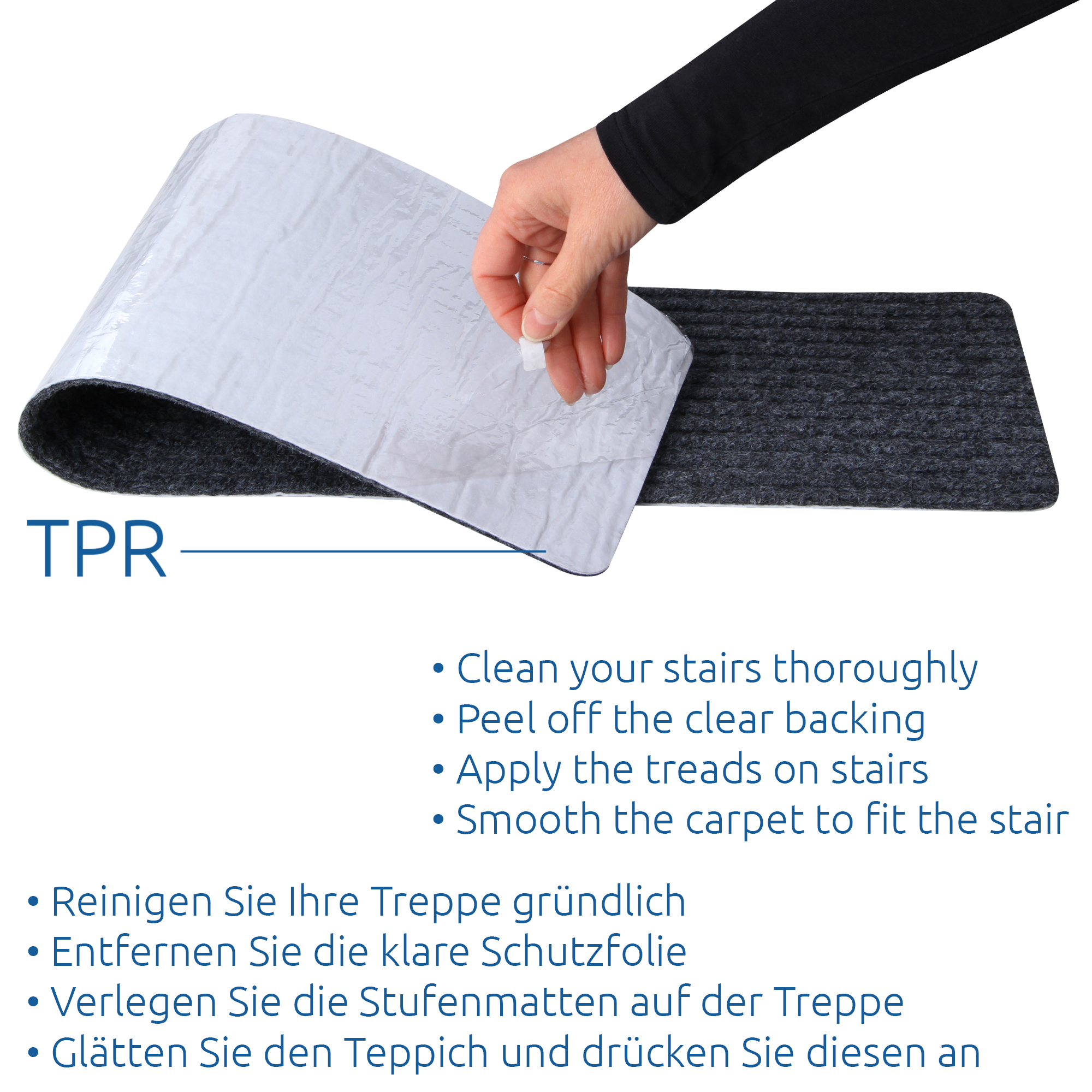 - TPR Unterseite - immer wieder haftend! Die TPR Schicht ist eine gummiähnliche Schicht, die es Ihnen ermöglicht die Teppichstufe immer wieder aufzunehmen und erneut zu verlegen! Das ist ideal für die Reinigung der Treppe sowie des Teppichs und Klebereste gibt es einfach nicht