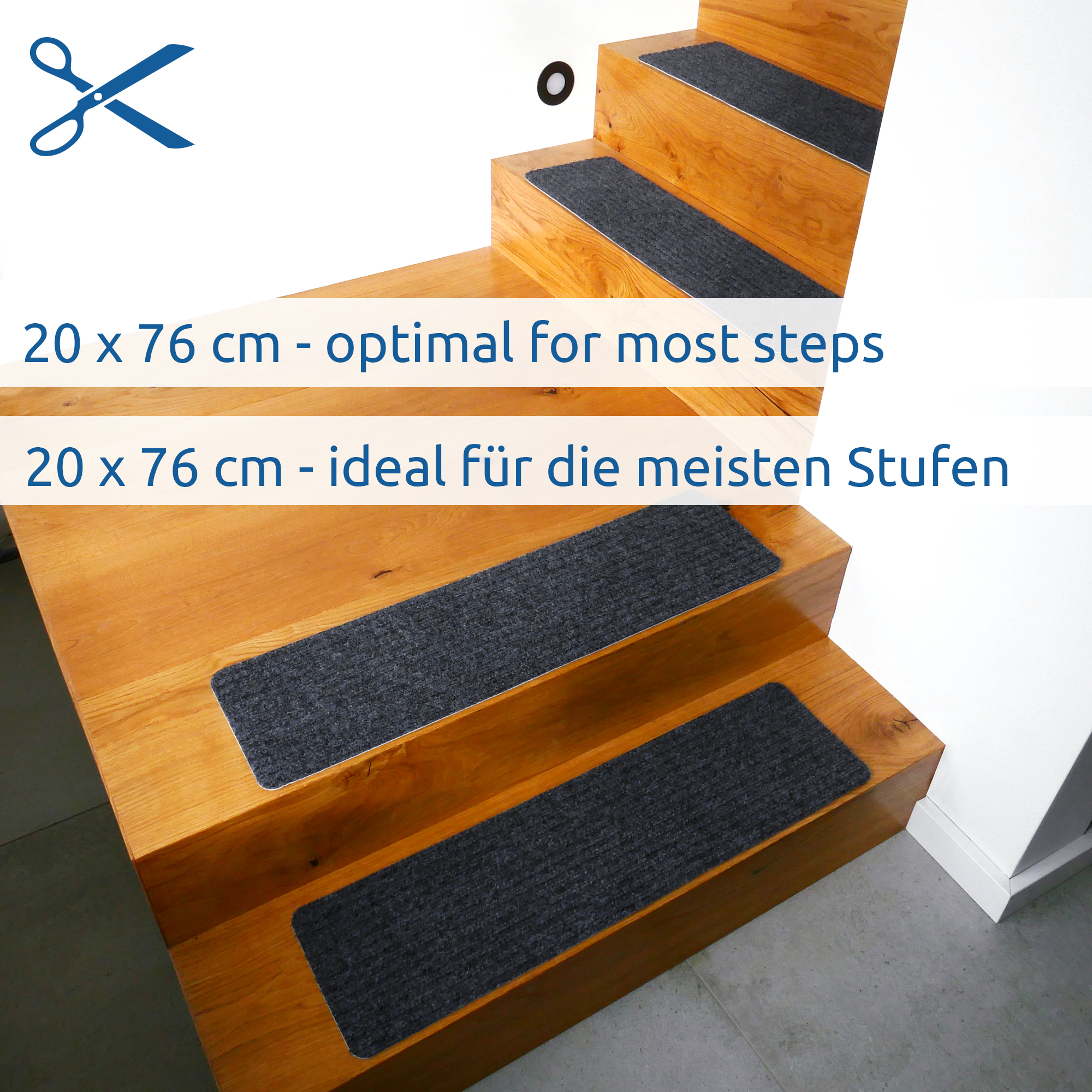 - Die Stufen-Matten sind 76x20 cm groß und können bei Bedarf auf Größe zugeschnitten werden. Die Stufenauflagen bieten wir als 15er und 5er Set in den Farben grau und hellgrau an
