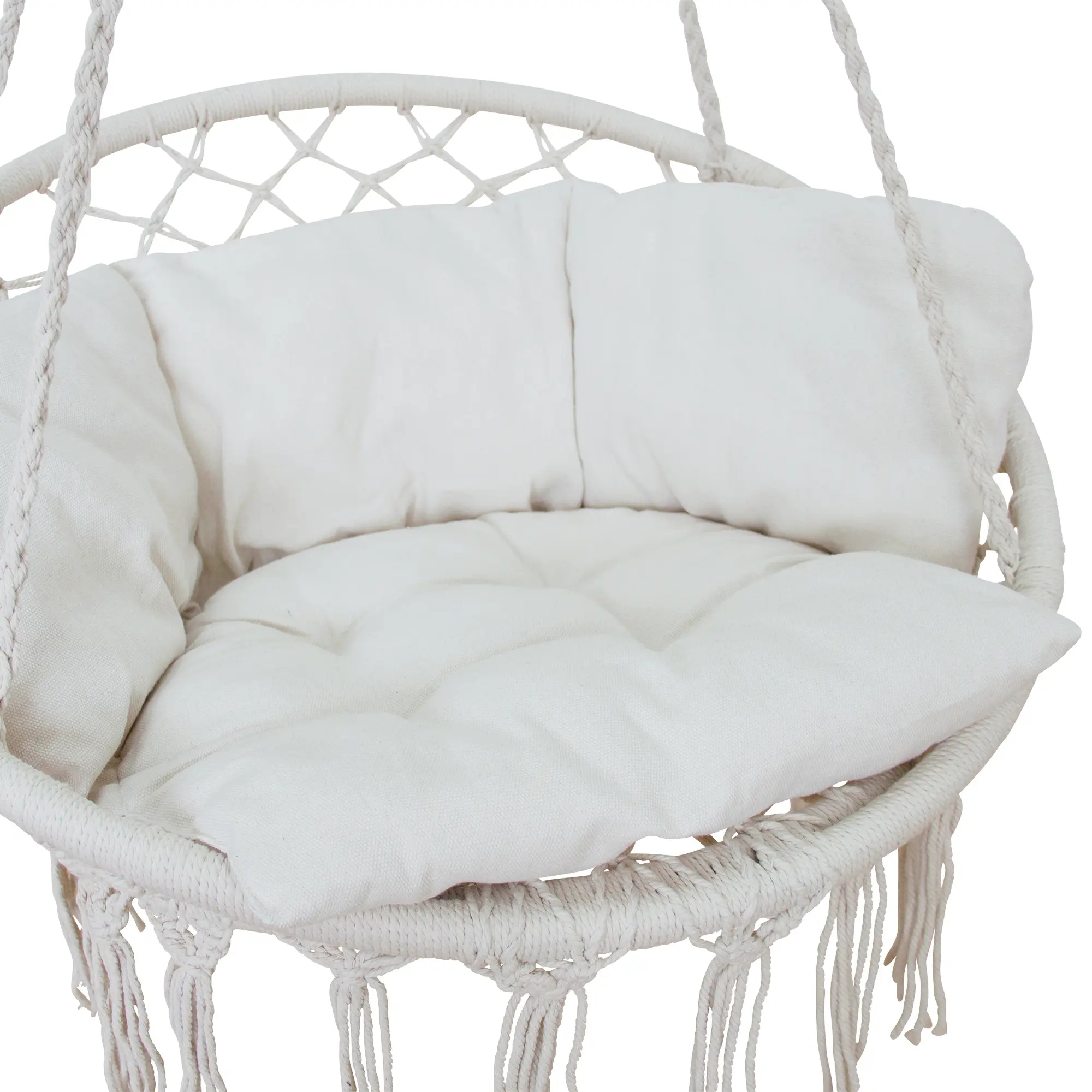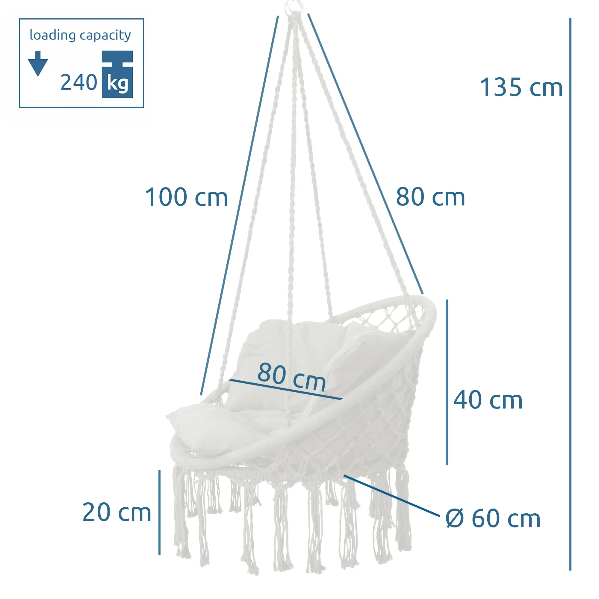- Robuste Konstruktion! 2 pulverbeschichtete Stahlringe, Ø 60cm + 80cm, bilden die Basis für diesen Swing Chair. Starke Seile verbinden die Ringe und das gesamte Baumwollgeflecht verleiht dem Relax Sessel seine Form und eine Belastbarkeit von 240 kg