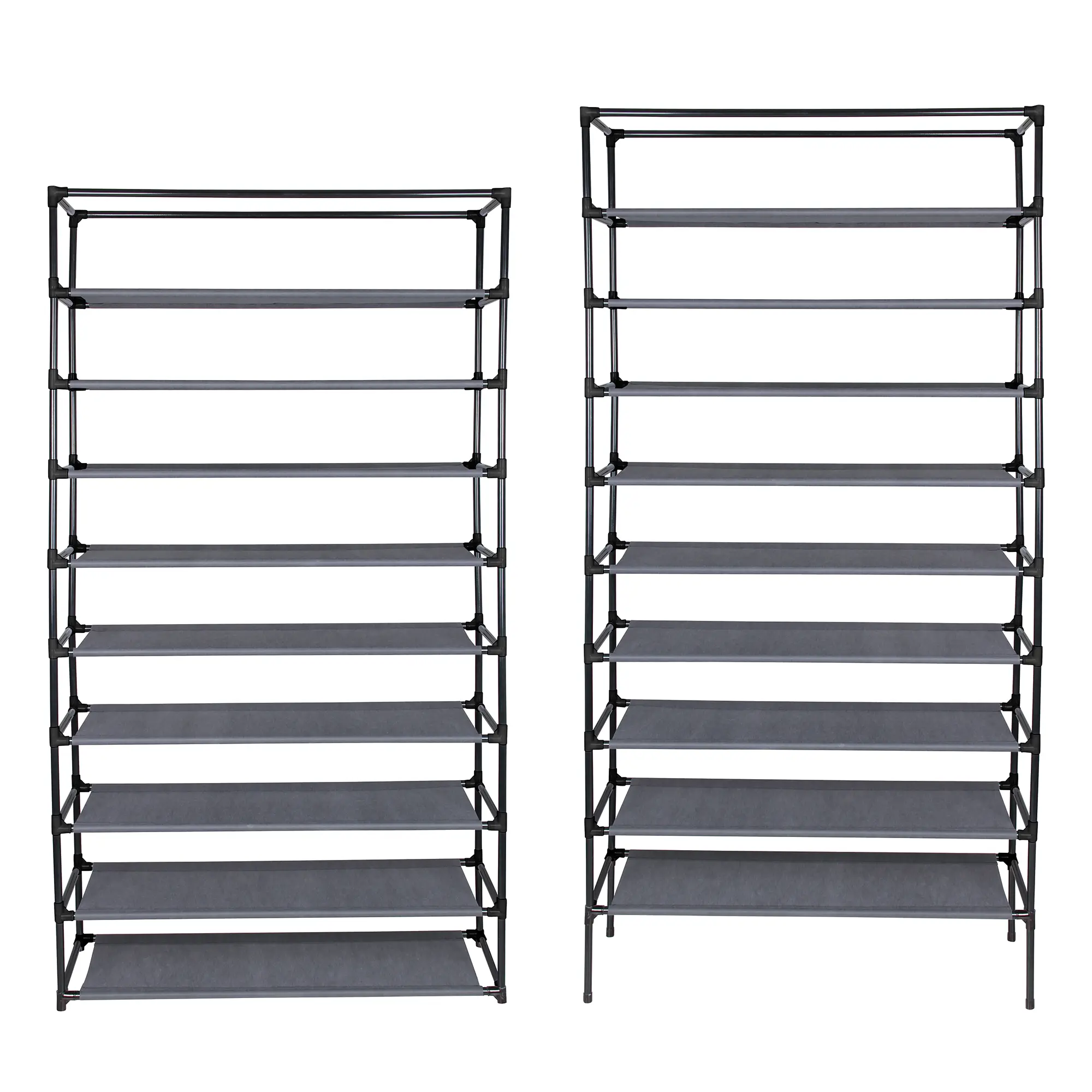 Das Grundgerüst des Schuhschranks bildet ein stabiles Regal aus schwarzen 16 mm Stahlstangen und Steckverbindern. Die Stahlrohre sind pulverbeschichtet und so bestens gegen Rost geschützt. Die Verbindungsstücke bestehen aus einem stabilen, bruchfesten Kunststoff und sind farblich den Stangen angepasst.