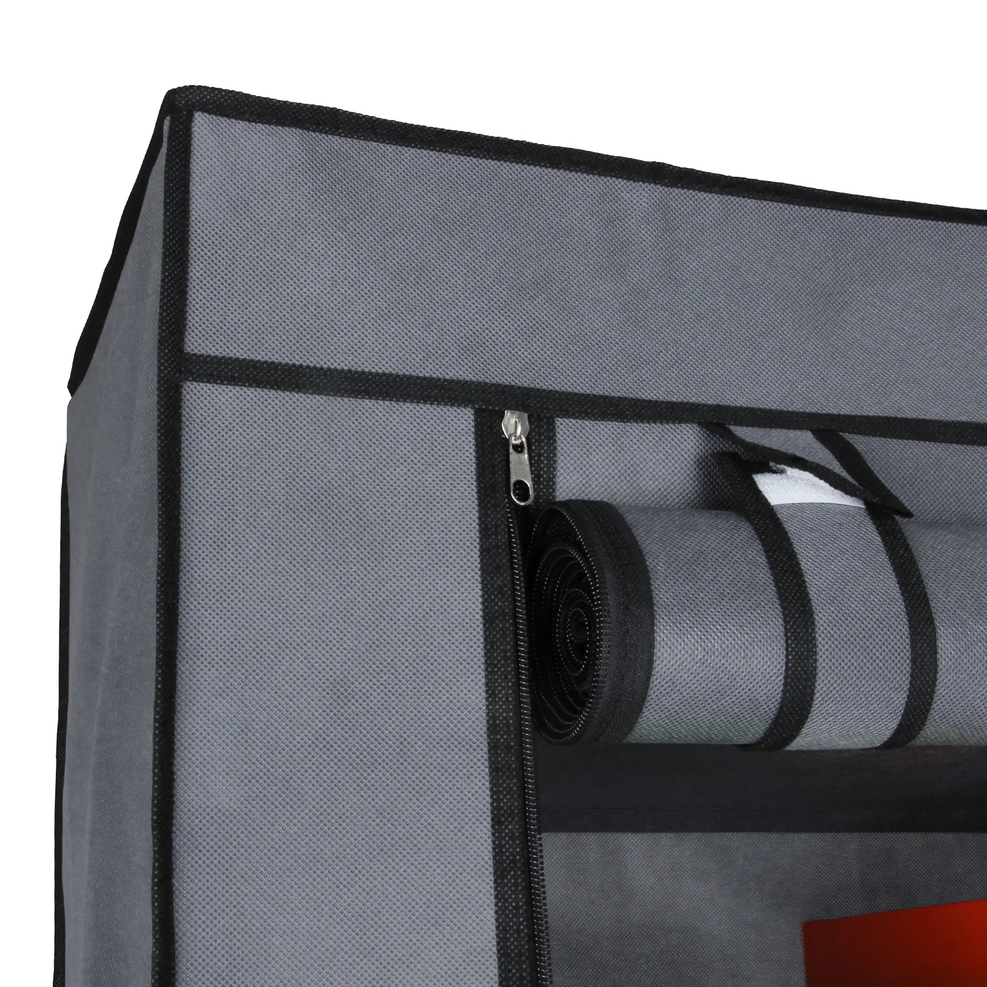 Der graue Überzug ist aus einem robusten Vlies-Gewebe hergestellt. Der Stoff ist atmungsaktiv, leicht zu reinigen, wasserabweisend und beständig gegen Feuchtigkeit. Die Reißverschlüsse sind leichtgängig und wie die Nähte in schwarz abgesetzt. Je nach Modell hat der Grado Schrank eine oder mehrere Türen die nach oben aufgerollt werden und mit Hilfe von Bändern mit Klettverschluss fixiert werden.