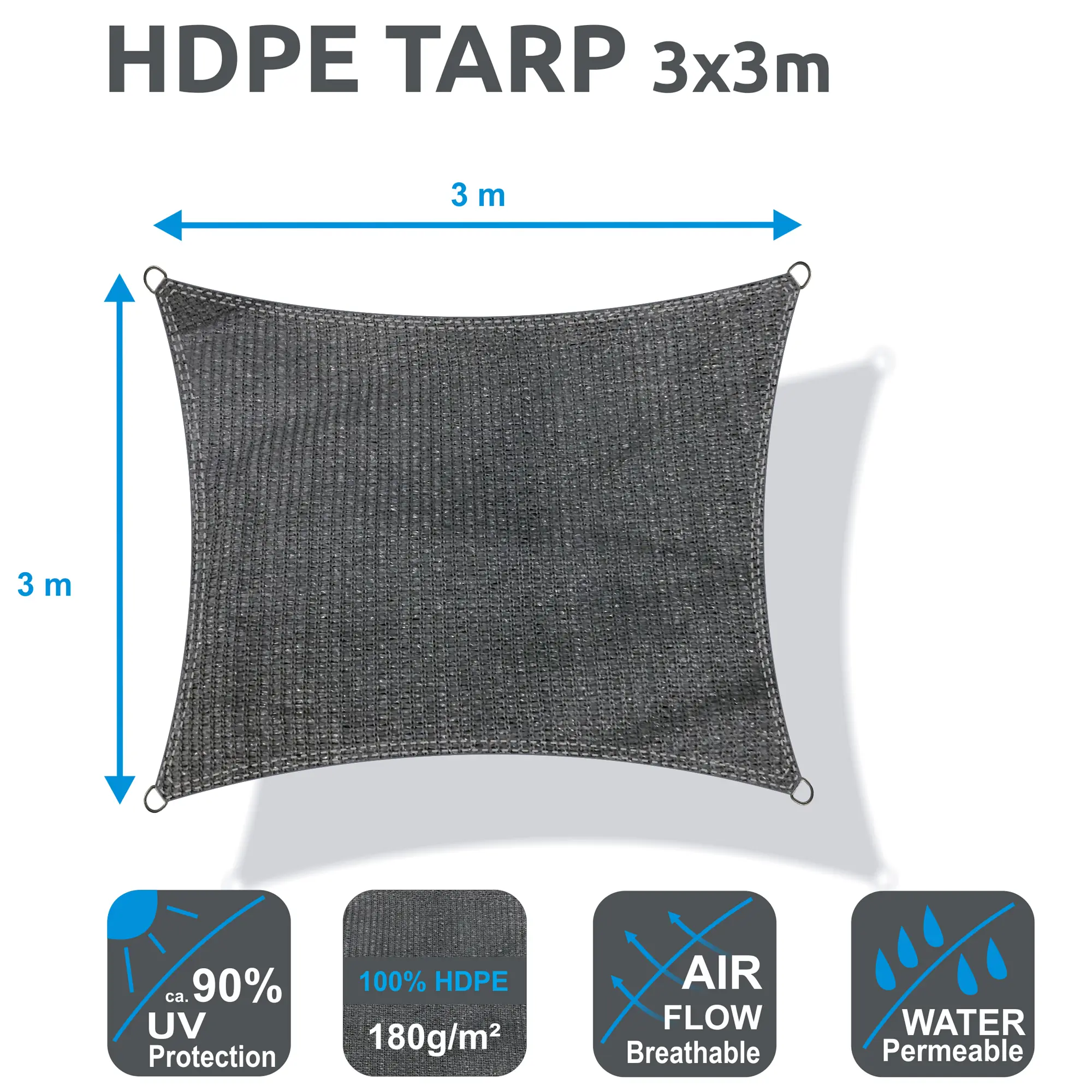 yourGEAR HDPE Tarp 3 x 3 Meter - Sonnensegel für Terrasse, Balkon, Camping, Garten, Festival und Events - luftiger Schattenspender mit 90% UV-Schutz